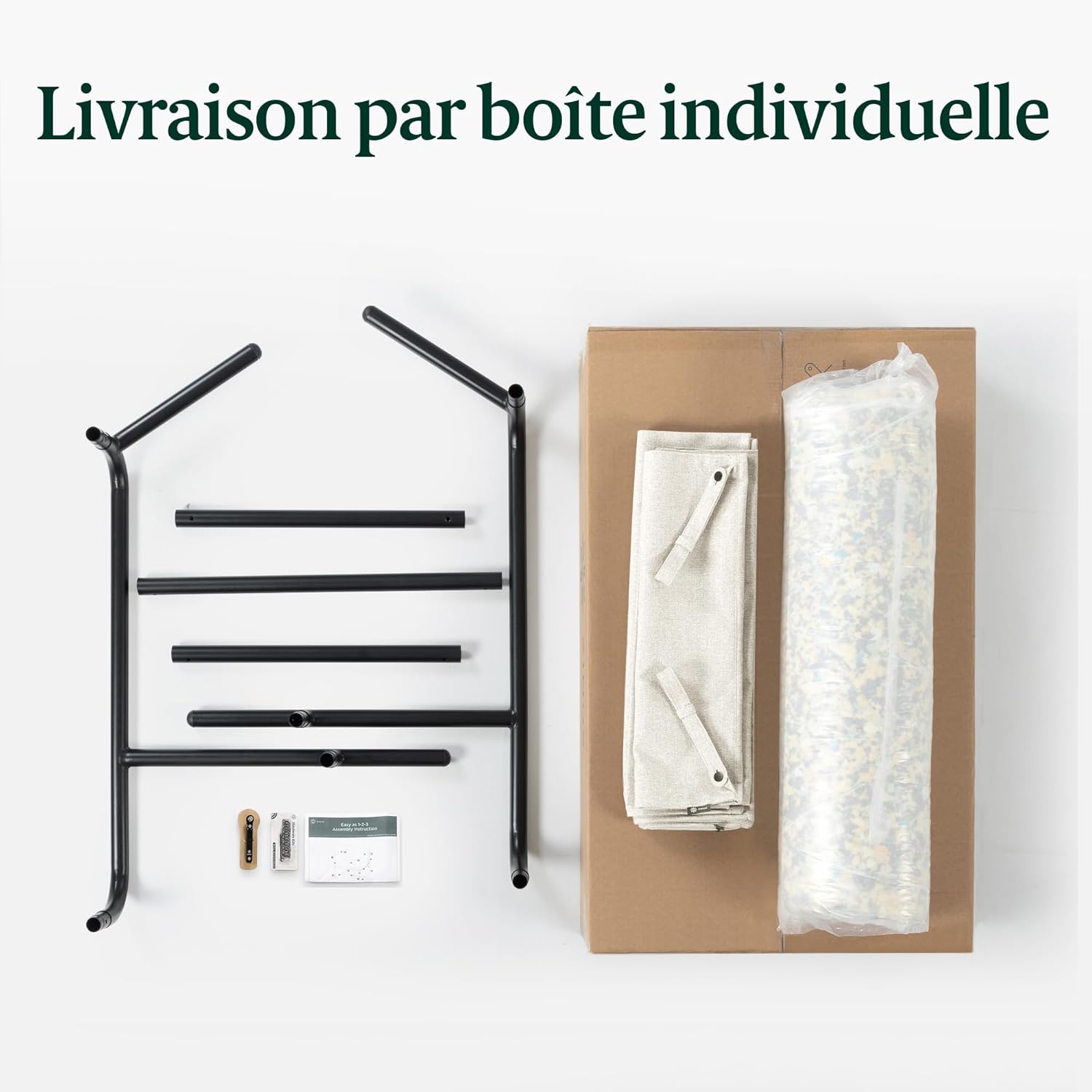 ASSEMBLAGE SIMPLE ET EMBALLAGE EFFICACE – Toutes les pièces, les outils et les instructions sont soigneusement emballés dans une boîte compacte qui arrive à votre porte ; l’installation prend moins de 30 minutes ; veuillez noter qu’il faut laisser les coussins en mousse se dilater pendant 72 heures avant de les utiliser