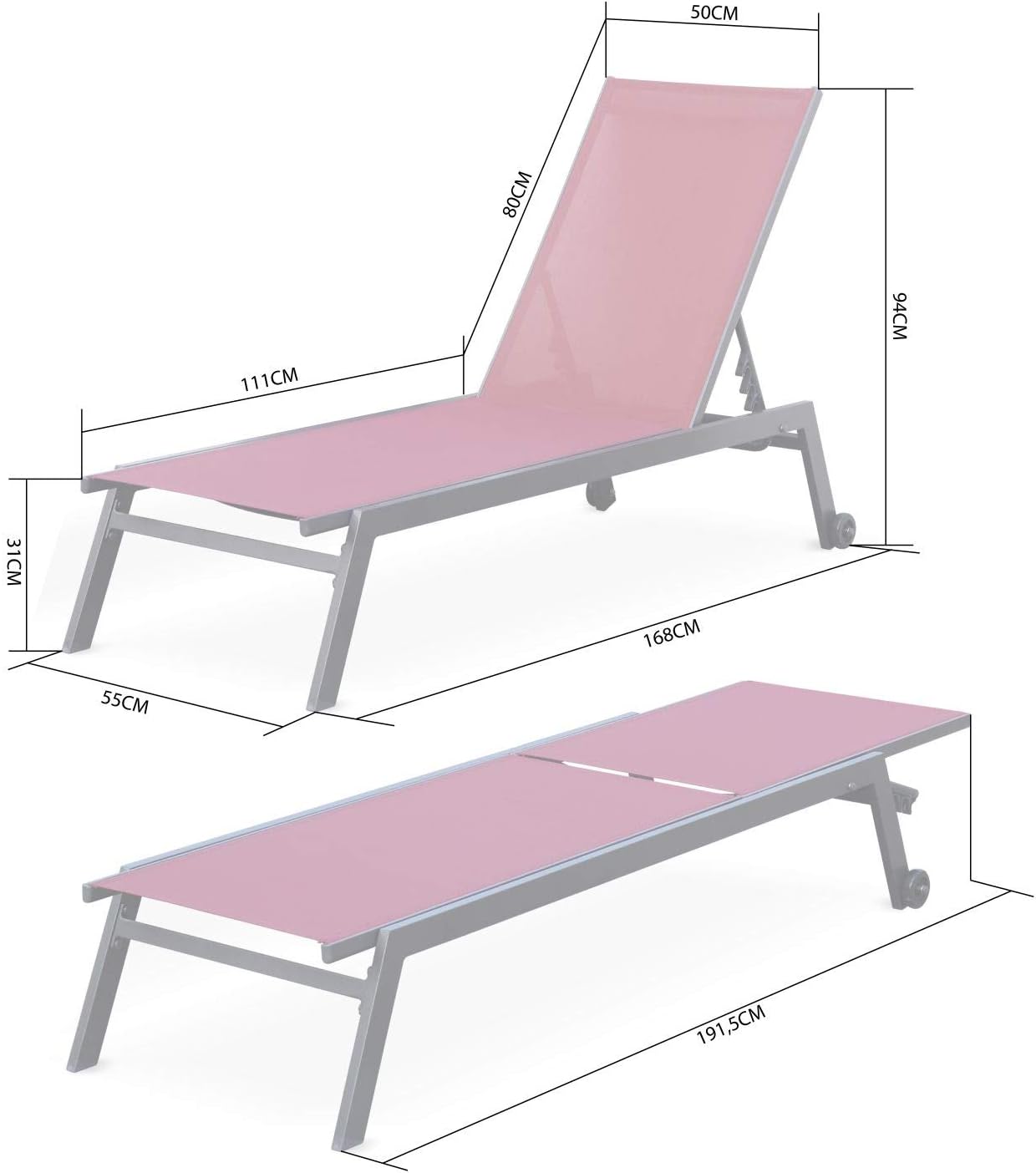 Transat allongé : L 191,5 x l 55 x h 31 cm / Transat avec dossier relevé au plus haut : L 168 x l 55 x h 94 cm