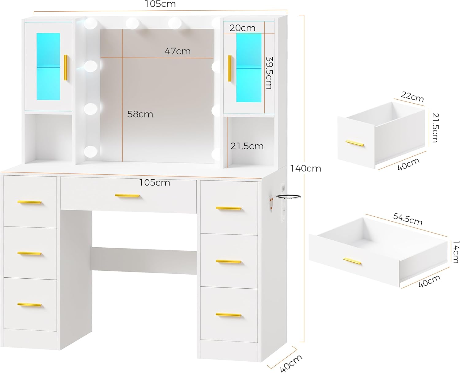 【COMMODE DE COIFFURE AU DESIGN RAFFINÉ】Ce grand meuble de toilette au design moderne est fabriqué à partir de matériaux robustes. Il comprend 7 tiroirs, un miroir éclairé et une multiprise intégrée. Dimensions totales : 105 cm (L) x 40 cm (l) x 140 cm (H)