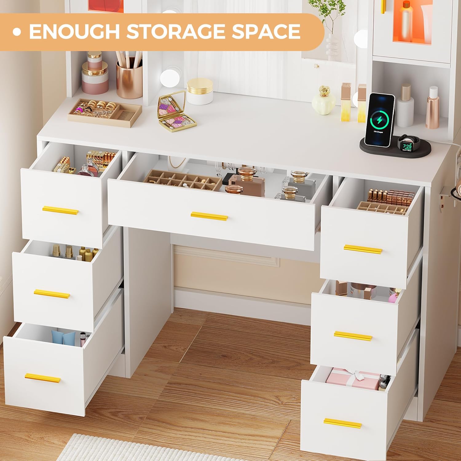【GRANDE CAPACITÉ DE RANGEMENT】Cet ensemble de vanité propose un espace de rangement généreux et fonctionnel. Le bureau, plus large, est équipé de 7 tiroirs. Il offre ainsi un vaste espace pour organiser vos bijoux, accessoires capillaires et cosmétiques, vous permettant de maintenir votre bureau en ordre en classant les articles selon vos préférences