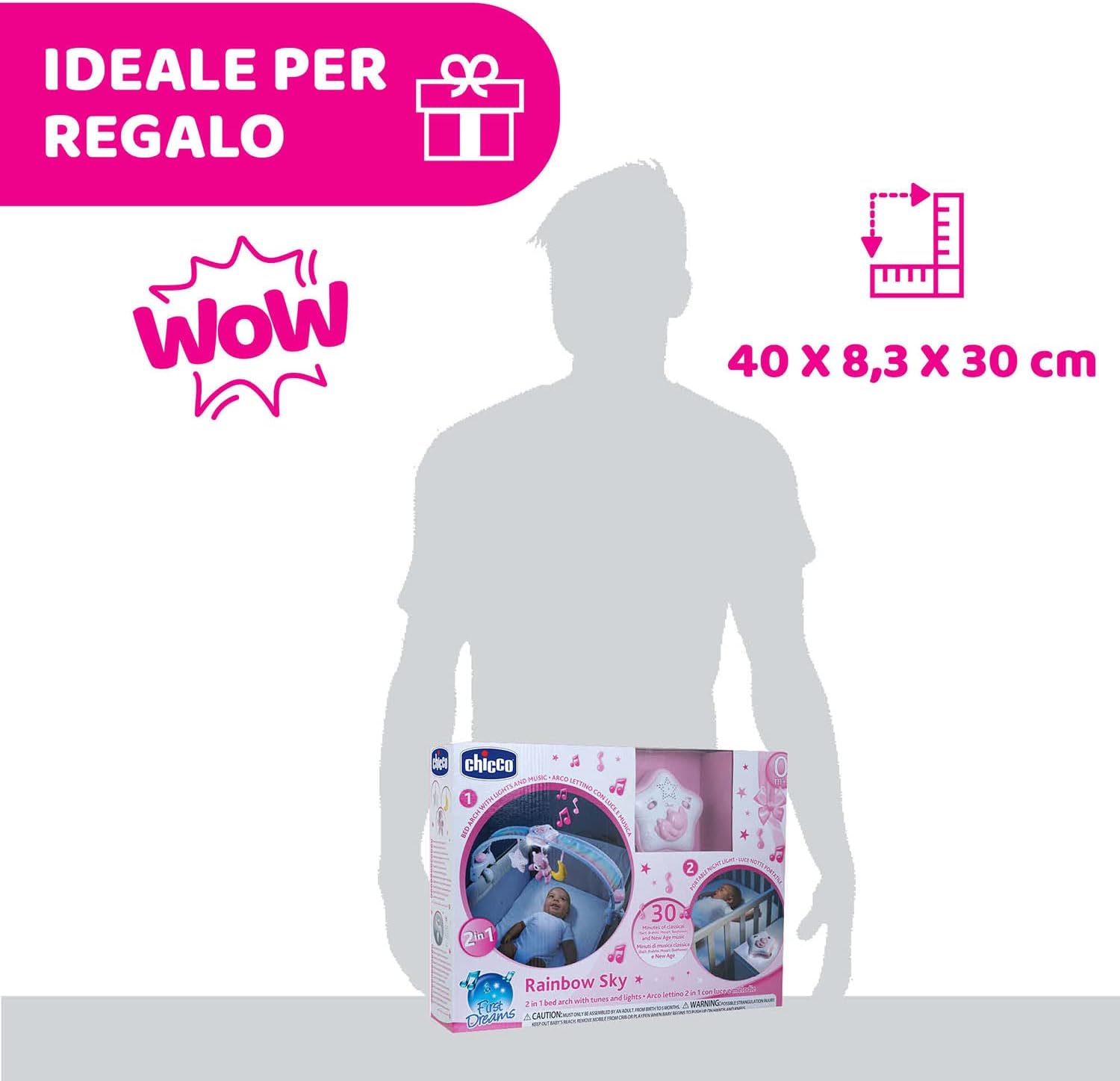 L’Arche Arc en Ciel de Chicco est l’arche d’éveil innovante 2en1 conçue pour créer une atmosphère magique dans la chambre et aider le bébé à s’endormir. Il diffuse de la musique classique (Bach, Brahms, Mozart, Beethoven) et New Age par cycles réglables de 15 et 30 minutes avec un sélecteur de volume pour s’adapter aux besoins de l’enfant. La douce lumière blanche de l’étoile crée un effet arc-en-ciel de lumières, de sons et de couleurs sur les côtés du panneau. Les 3 pendentifs en tissu (ours, lune et étoile) amusent le nouveau-né et accompagnent progressivement l’enfant dans le monde des rêves ; ils peuvent être retirés et servir de premières peluches à votre bambin.