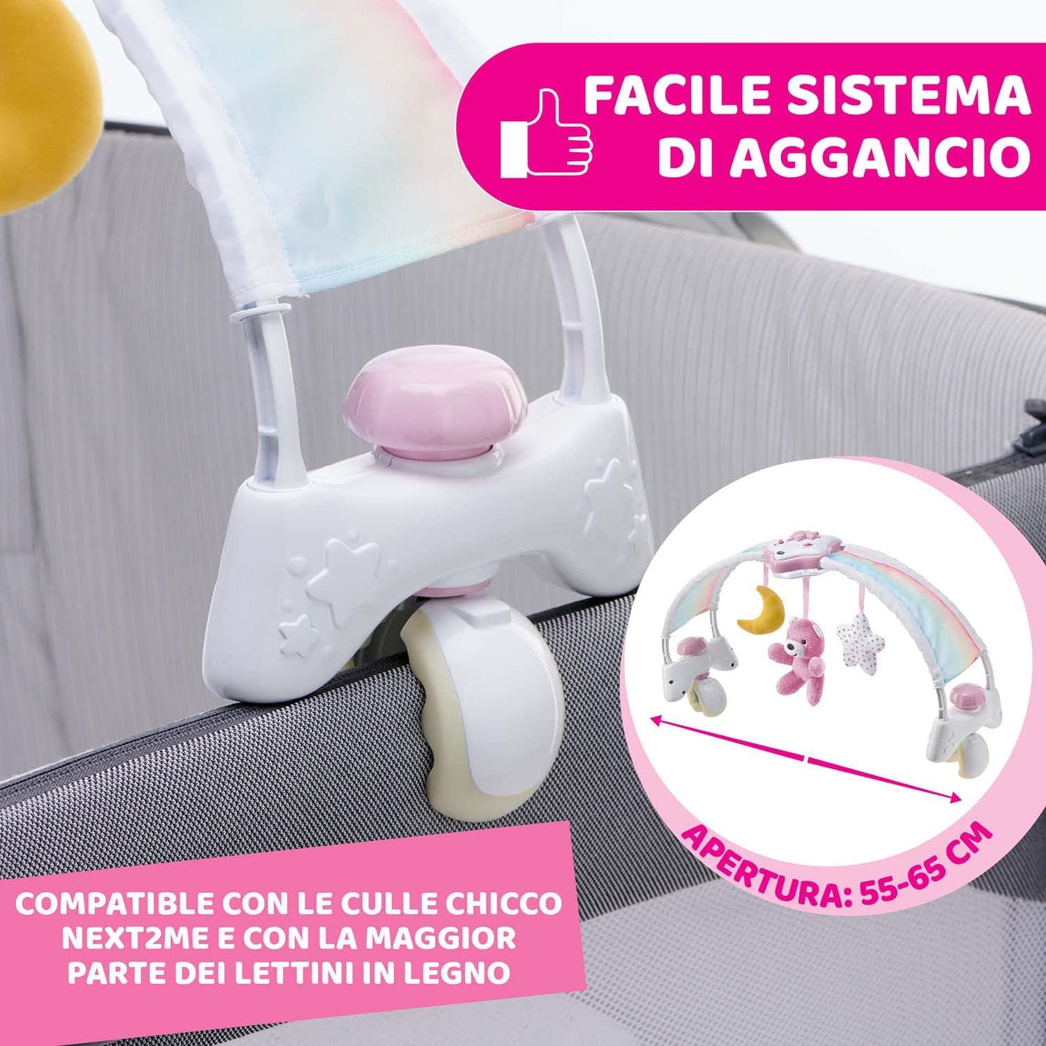 COMPATIBLE : Ce jeu d’éveil est compatible avec tous les modèles de berceaux Next2Me de Chicco et avec la plupart des autres lits d’enfants et berceaux du marché ; il est facile à positionner grâce à un système de fixation pratique et sûr
