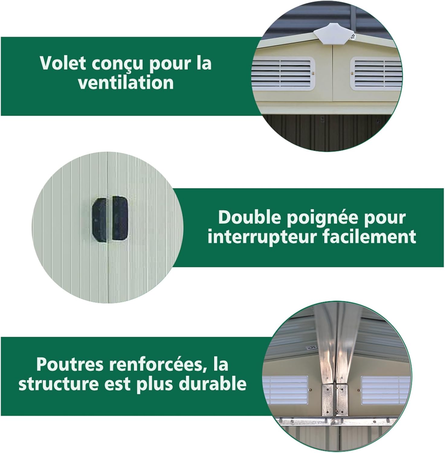 【Utilisation facile et sûre :】Cet abri de jardin est équipé de deux bouche d’aération qui sont conçu pour être imperméable mais aussi pour ventiler votre abri et empêcher les odeurs et les moisissures de se développer. De plus, les portes coulissantes sont faciles à ouvrir. L’abri de jardin peut aussi être verrouiller avec un cadenas (non-inclus) car il y a déjà un trou prévu à cet effet dans la poignée de la porte.