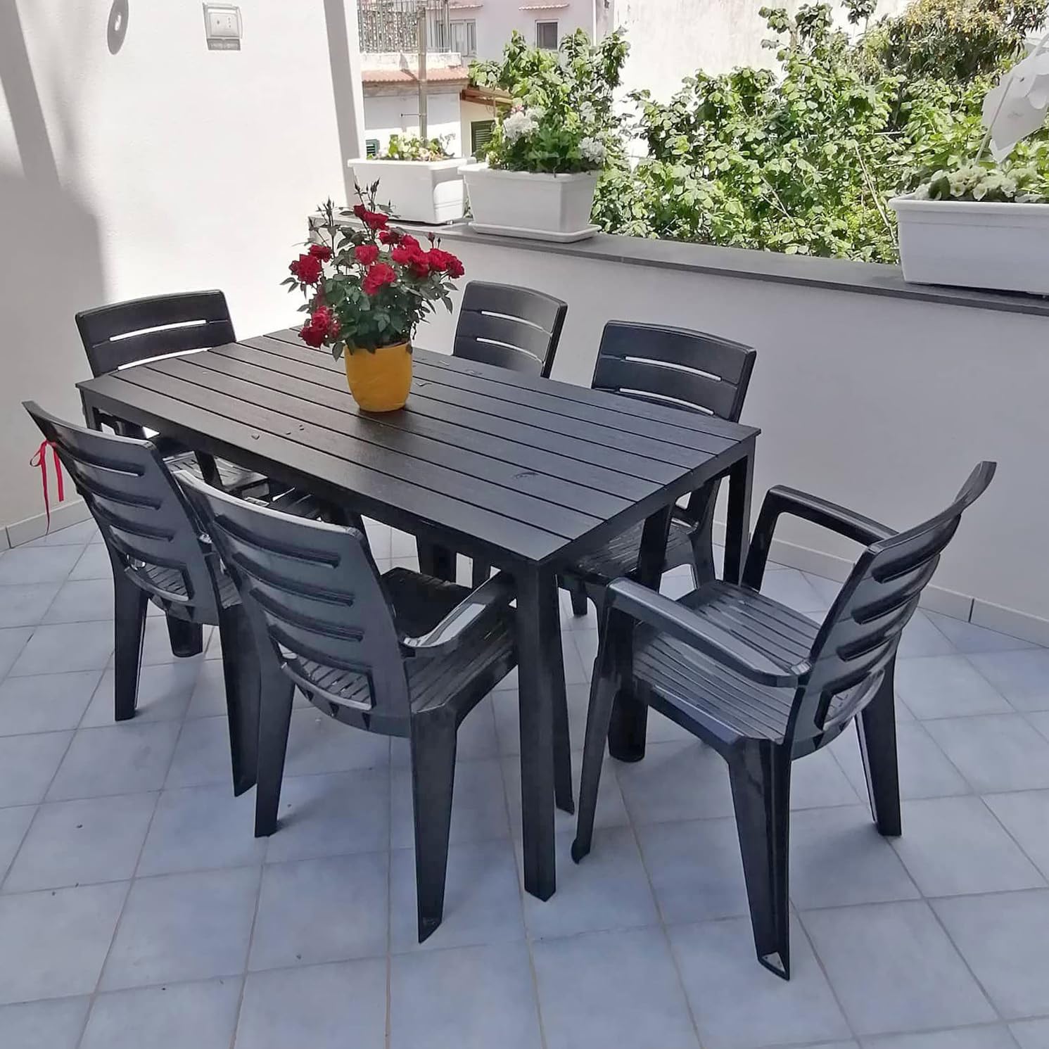 Parfait pour les déjeuners et les dîners en plein air, il accueille jusqu’à six personnes. Il a une solide structure en acier verni qui garantit stabilité et un plateau en polyéthylène effet bois, élégant et facile à nettoyer. Le montage est rapide et intuitif, idéal pour tout environnement extérieur.
