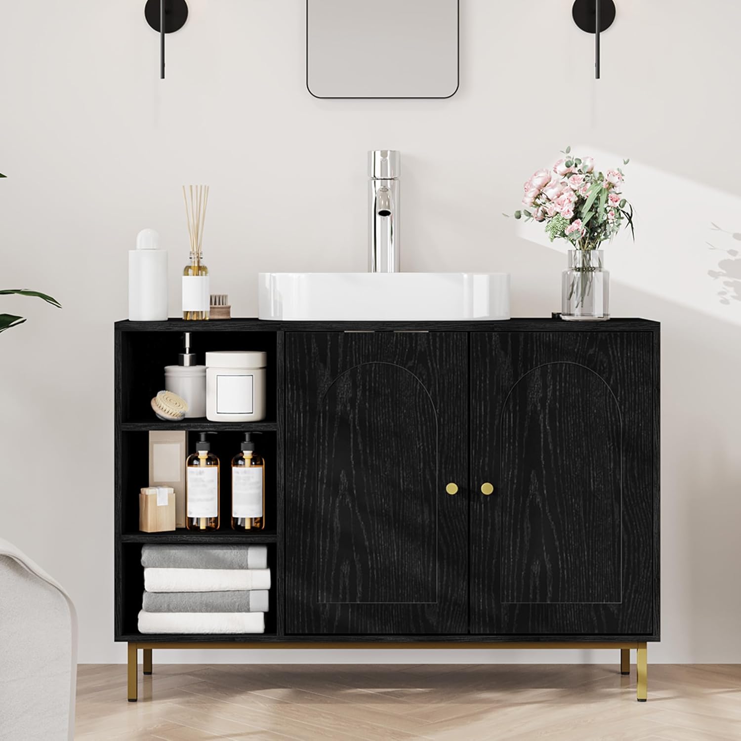 Meuble d’évier polyvalent : Ce meuble de salle de bain est conçu pour être placé sous votre évier ouvert avec un design en forme de U,fournissant un espace de rangement pratique pour votre salle de bain,Les compartiments ouverts pour un accès facile et la conception à double porte empêchent efficacement vos articles d’être mouillés