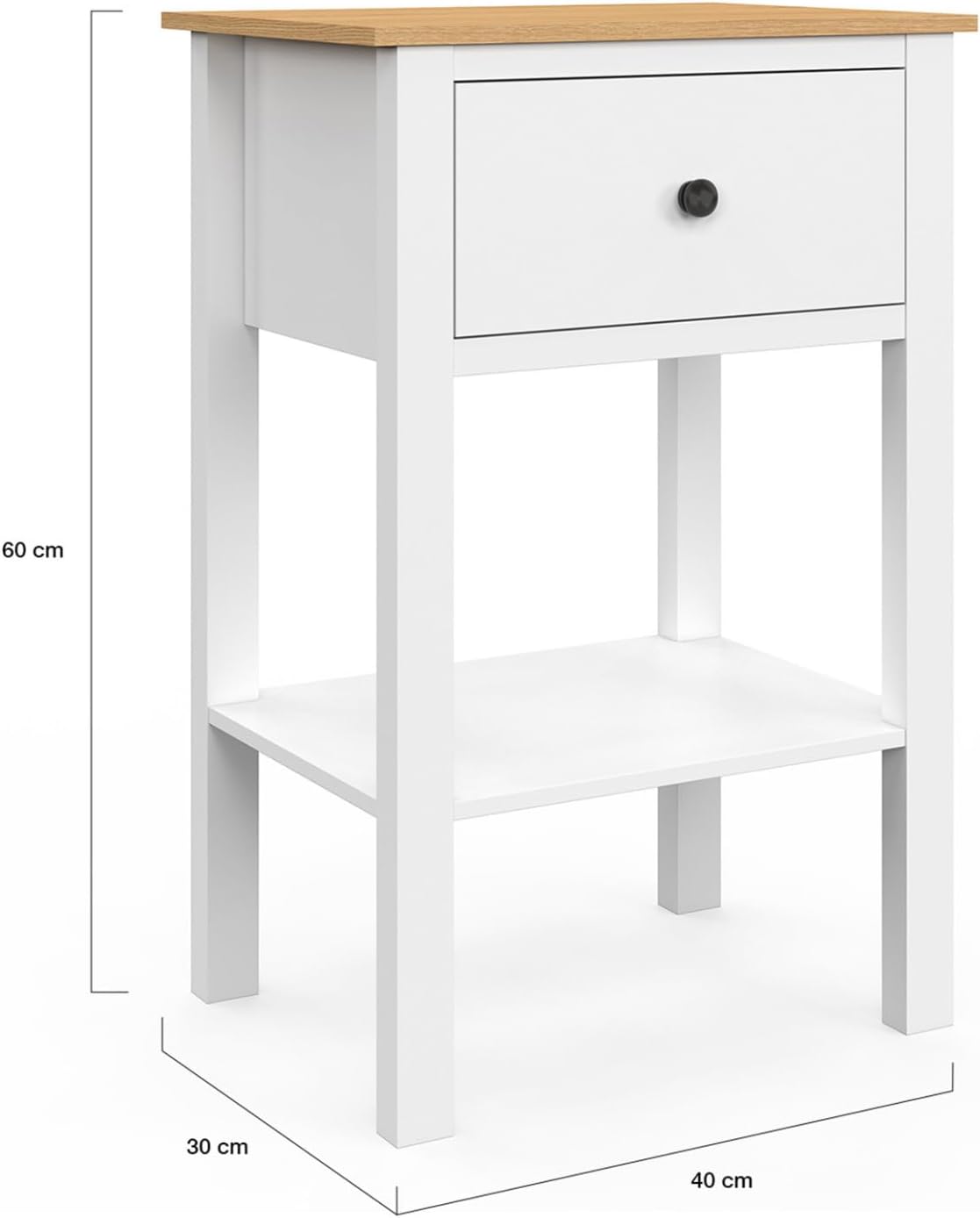 Dimensions totales : L. 40 x l. 30 x H. 60 cm – Hauteur entre l’étagère et le tiroir : 23,5 cm