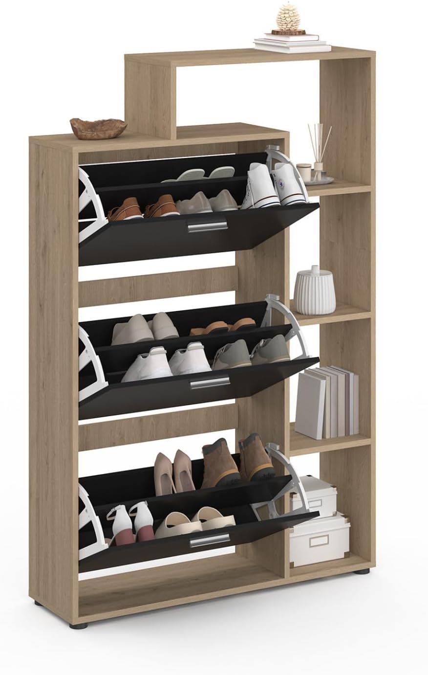 Descriptif du meuble à chaussures imitation hêtre 3 portes noires avec étagère Gagnez de l’espace et du temps dans votre maison, dans votre entrée, dressing ou buanderie, avec notre meuble à chaussures 3 portes avec étagères !Ce range-chaussures, maxi capacité, aux couleurs naturelles, chic et tendance, s’intègre parfaitement dans n’importe quel type d’intérieur grâce à son design épuré. Peu profond, il laissera le passage dégagé !Il habille tout type de couloir, d’entrée, de pièce, de façon moderne !Ouvrez chaque casier à l’aide de la poignée finition argentée. Le mécanisme type menu déroulant vous permet de choisir rapidement la paire qu’il vous faut. Chaque espace de rangement possède une planche modulable séparant les deux rangées de paires de chaussures.Ce meuble vous offre une grande capacité de rangement, il peut contenir jusqu’à 6 paires de chaussures par espace de rangement, soit 18 paires au total = 36 chaussures, que vous pouvez organiser par rangée et trier par saison !Gain de place au sol assuré avec ce meuble conçu en hauteur ! Fini les chaussures qui traînent dans l’entrée ou qui prennent la poussière !L’étagère 5 niveaux, 4 niches et 1 plateau, double la capacité de rangement. Plus besoin de chercher vos clés ou votre courrier ! Vous n’avez plus qu’à y disposer une petite plante verte et des paniers de rangement pour apporter votre petite touche de décoration pour un intérieur chaleureux et personnalisé.La structure de ce meuble en panneaux de particules de bois (PB épaisseur 1,5 cm) vous garantit solidité et robustesse.4 patins sont offerts pour ce meuble.Facile à monter.Pour éviter tout risque de basculement, il est recommandé de le fixer au mur.Meuble à chaussures prévu pour des pointures allant jusqu’au 41.Dimensions du meuble à chaussures façon hêtre 3 portes noires avec étagèresDimensions totales : Longueur 90,5 cm x largeur 24 cm x Hauteur 135,5 cmDimensions du meuble à chaussures : Long