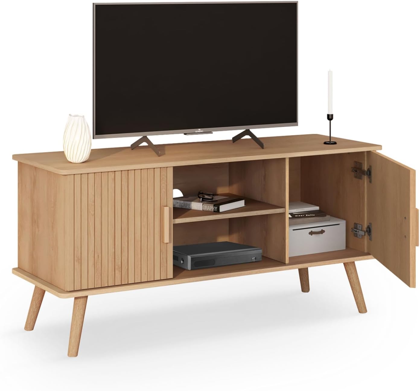 Ajoutez une touche de sophistication à votre intérieur avec le meuble TV JULIETTE ! L’alliance entre le bois clair et l’effet lattes sur les portes apporte un esprit naturel et chaleureux à votre salon. Il saura s’accorder à tous les types de décorations. Cette console TV offre un design moderne et élégant avec son coloris bois et ses finitions épurées qui sublimeront votre intérieur en un tour de main ! Ses coins arrondis et ses pieds fuselés en font un meuble télévision design et moderne. Doté d’un plateau d’une longueur de 110 cm, il peut accueillir un écran plat jusqu’à 43 pouces. Profitez de soirées télé réussies !Le meuble TV JULIETTE est à la fois esthétique et pratique ! En effet, en plus d’être un élément de décoration tendance il offre de nombreux rangements avec 2 placards ainsi que deux niches ouvertes. Petit plus, dans la niche supérieure se trouve un trou passe-câbles afin de pouvoir brancher votre box, votre console et tout autre matériel électronique tout en cachant les fils derrière le meuble !Ce meuble TV peut être utilisé dans d’autres pièces comme la salle à manger en tant que buffet ou dans la chambre en tant que commode ! Sa structure en panneaux de particules de bois et ses pieds fuselés vous assurent solidité et stabilité au quotidien. Ce meuble TV avec portes effet lattes est l’addition parfaite pour tout intérieur moderne en combinant esthétique et praticité. Ne manquez pas cette opportunité de rehausser votre espace de vie !Dimensions du meuble TV JULIETTE 2 portes 110 cmDimensions globales : Longueur 110 cm x largeur 40 cm x Hauteur 54 cmDimensions placards : Longueur 30 cm x largeur 36 cm x Hauteur 33 cm Dimensions niches : Longueur 40 cm x 36 cm x 16 cm Matériaux : Panneaux de particules de bois (PB) + lattes en MDFÀ monter soi-mêmeRetrouvez l’ensemble de notre collection contemporaine sur notre boutique en ligne !