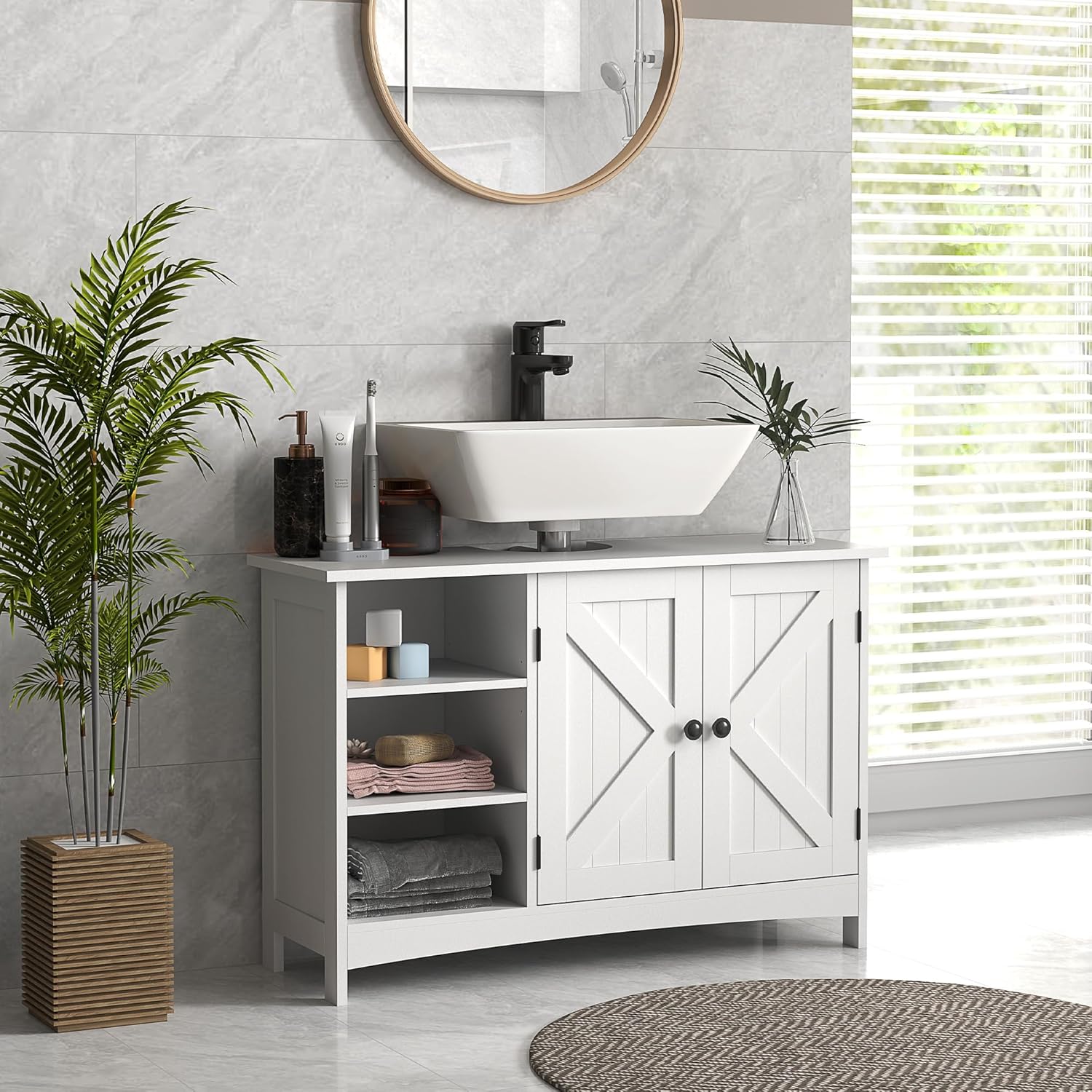 Espace de rangement : gardez tous vos produits quotidiens bien organisés dans le meuble de salle de bain grâce aux 3 étagères ouvertes et à l’armoire à 2 portes, doté d’une étagère intérieure réglable pour s’adapter à vos besoins d’espace