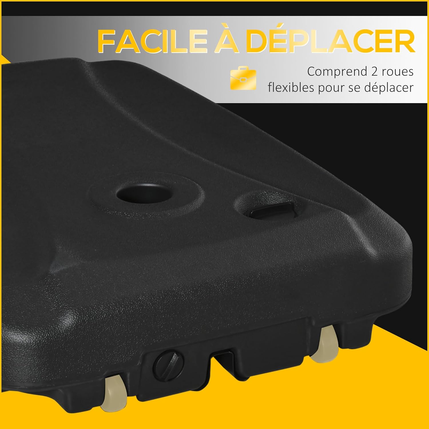 TRANSPORT FACILE : Doté de deux roues flexibles, ce pied de parasol facilite le déplacement pour vous offrir de l’ombre optimale où que vous soyez.