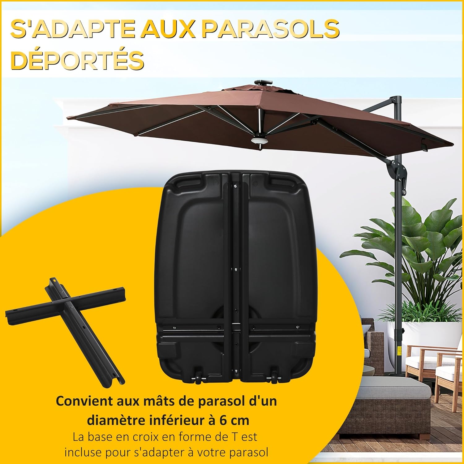UTILISATION POLYVALENTE : Idéal pour stabiliser les parasols à base croisée, ce support de parasol maintient votre parasol droit et stable, augmentant ainsi la zone d’ombre. Parfait pour le patio, la terrasse, le bord de piscine et autres zones de loisirs extérieurs.