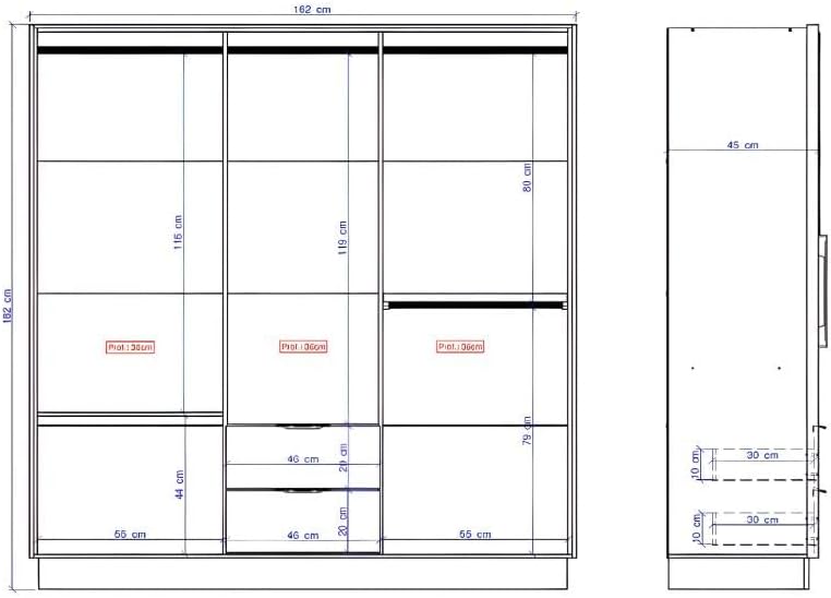 • Type de rangement : 2 tiroirs, 2 lingères, 4 penderies