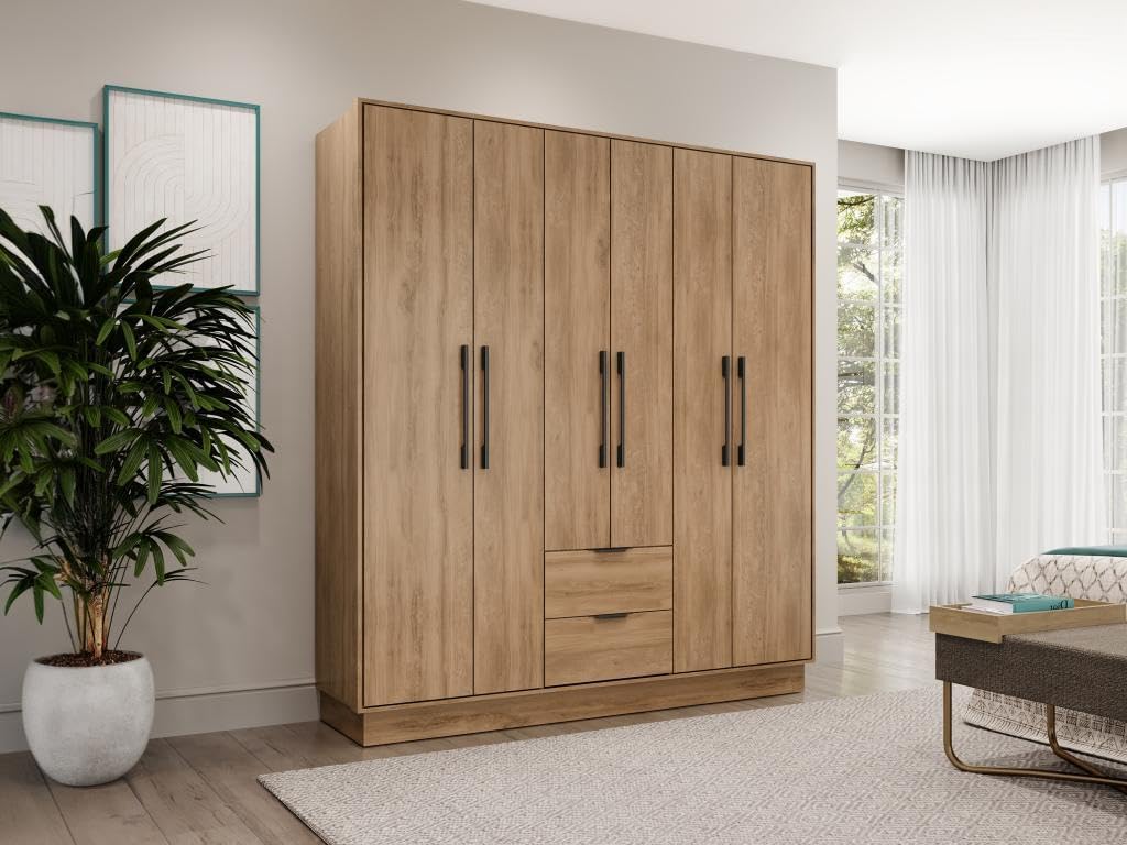 Armoire 6 portes et 2 tiroirs – Structure : Panneaux de particules et MDF – Coloris : Naturel – Dimensions : L162 x P46,5 x H182 cm – Style : Intemporel- Gagnez de l’espace grâce à l’armoire FEOVA, votre solution de rangement idéale !