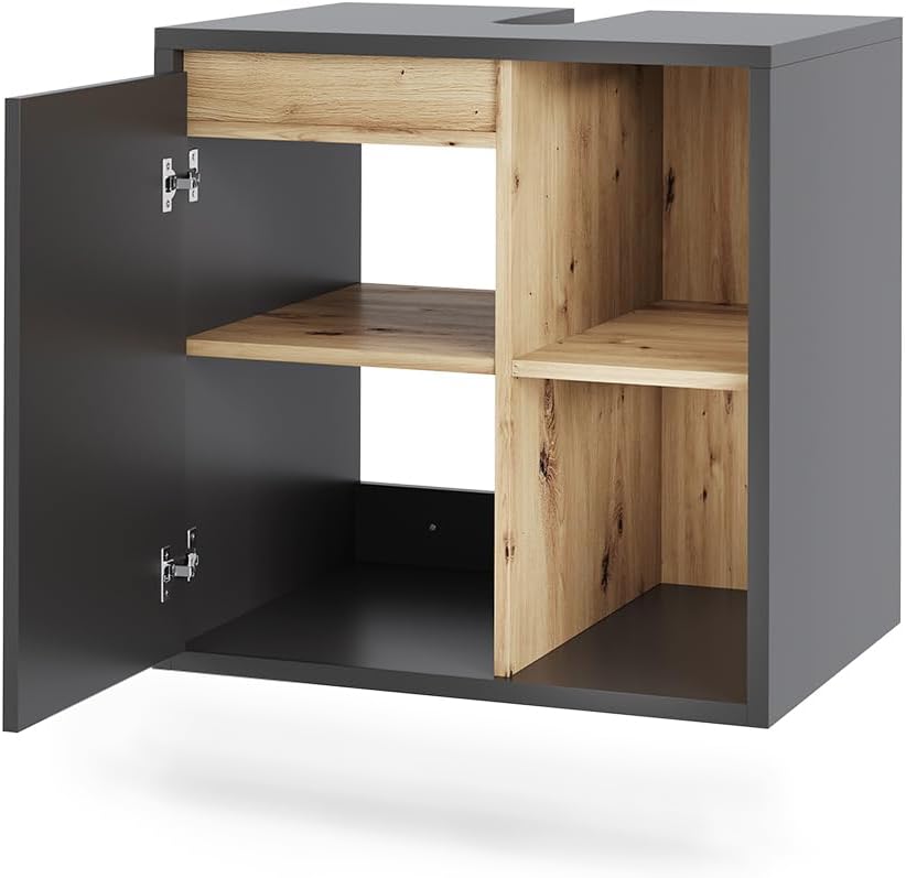 L’armoire sous lavabo Viola allie un design moderne à une fonction pratique. Une porte, deux compartiments ouverts et deux compartiments fermés offrent suffisamment d’espace de rangement pour vos ustensiles de bain. Idéal pour les petites salles de bains – pour plus d’ordre, de style et une touche d’élégance dans la pièce.—