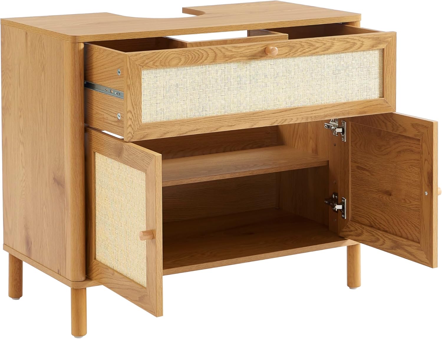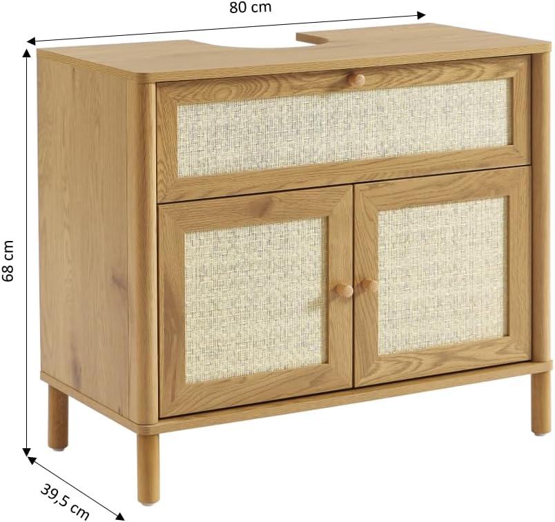 DESIGN NATUREL: Meuble de salle de bain avec finition effet chêne et façades en rotin pour une esthétique douce et intemporelle.