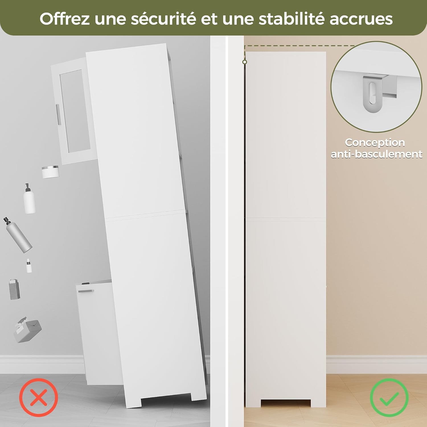 Armoire de qualité : l’armoire haute est fabriquée en bois de haute qualité et avec des ferrures métalliques, ce qui la rend stable, robuste et durable. La structure globale de l’armoire est bien conçue, ce qui lui confère une grande capacité de charge. L’armoire entière peut supporter 80 kg. Pour plus de sécurité, l’armoire haute de salle de bain est équipée d’un dispositif anti-basculement qui la rend plus stable