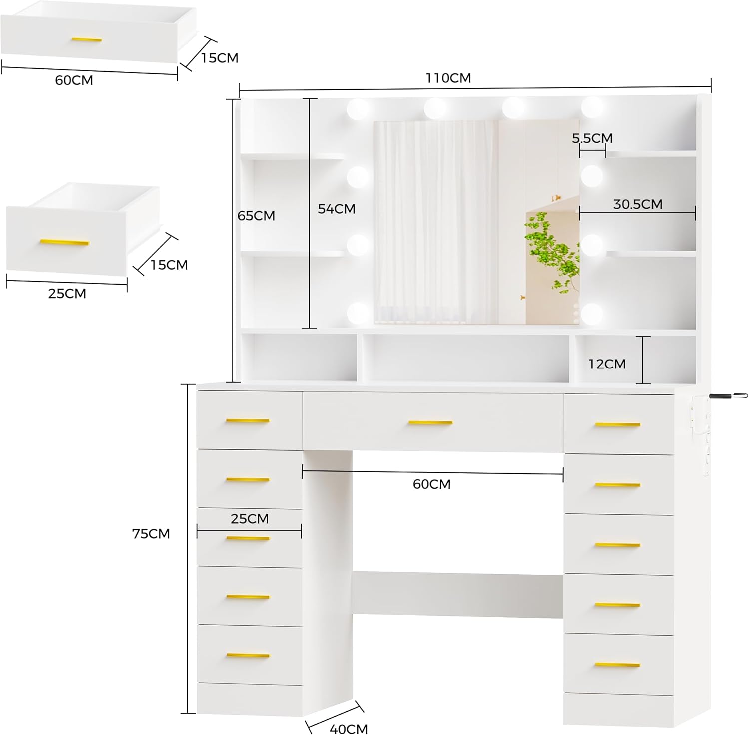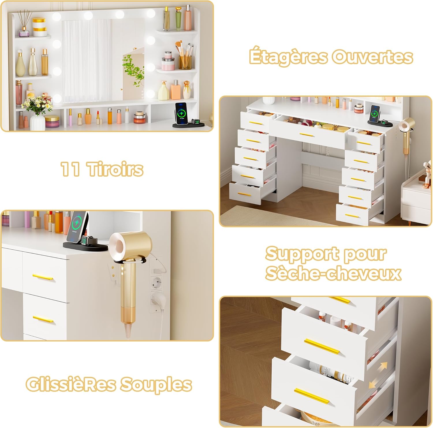 【COIFFEUSE AVEC PRISE】Cette coiffeuse blanche comprend deux prises standard, deux ports USB et Un support pour sèche-cheveux. Le design prise de courant intégrée permet non seulement de recharger les téléphones portables et autres appareils électroniques, mais offre également un accès et un rangement pratiques pour les outils de coiffure tels que les sèche-cheveux et les fers à friser