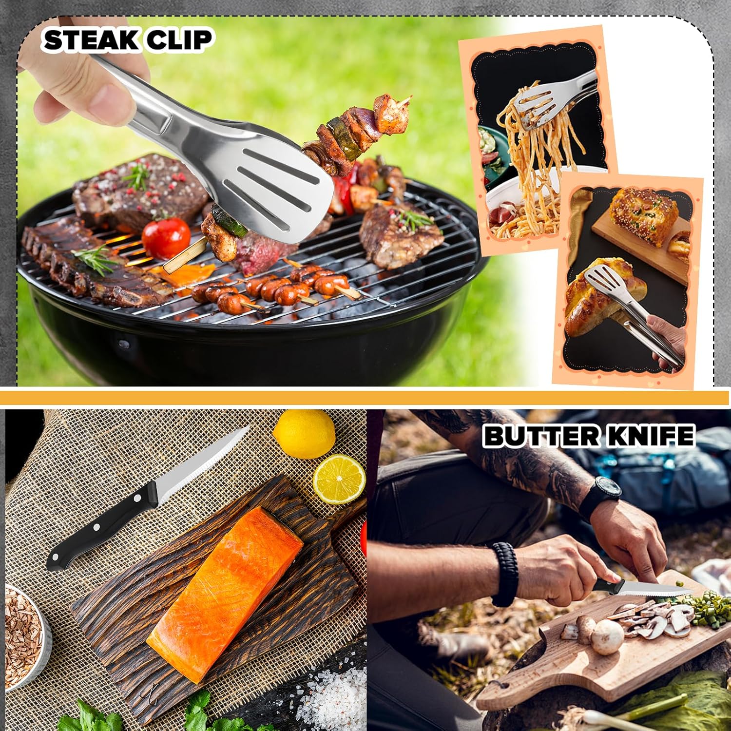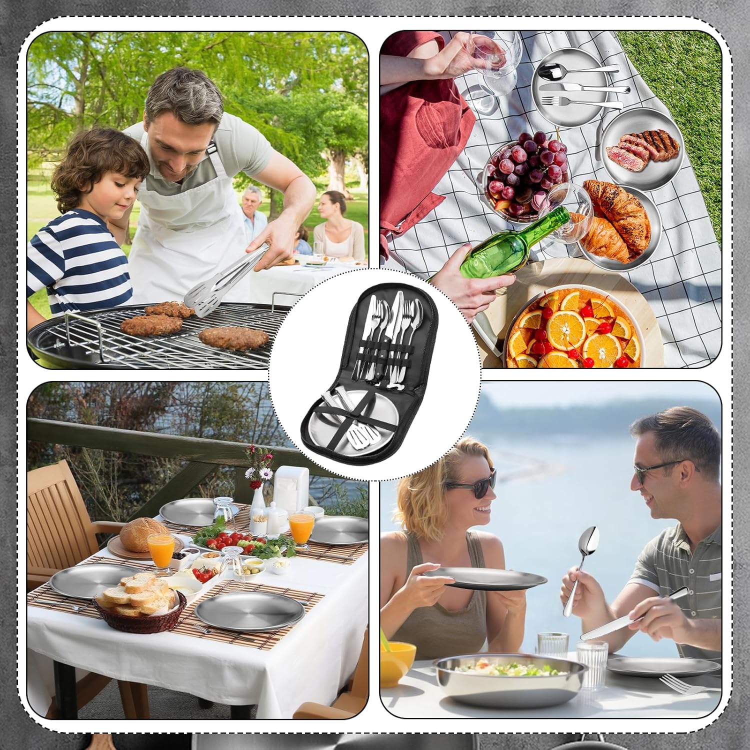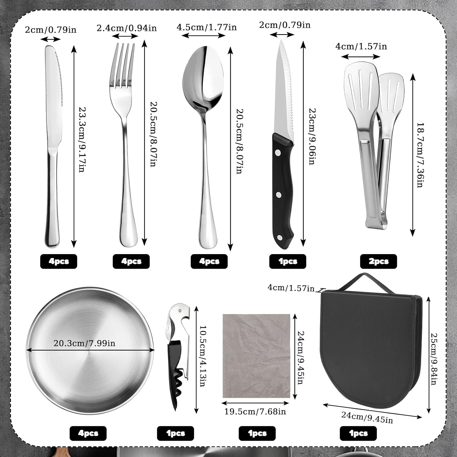 Ensemble de vaisselle en argent : cet ensemble de vaisselle portable est conçu pour répondre à tous vos besoins de repas en plein air. Service de table : 4 fourchettes, 4 cuillères, 4 couteaux de table, 1 couteau à beurre, 4 assiettes plates, 2 pinces à steak, 1 chiffon de nettoyage, 1 sac de rangement portable et 1 décapsuleur.