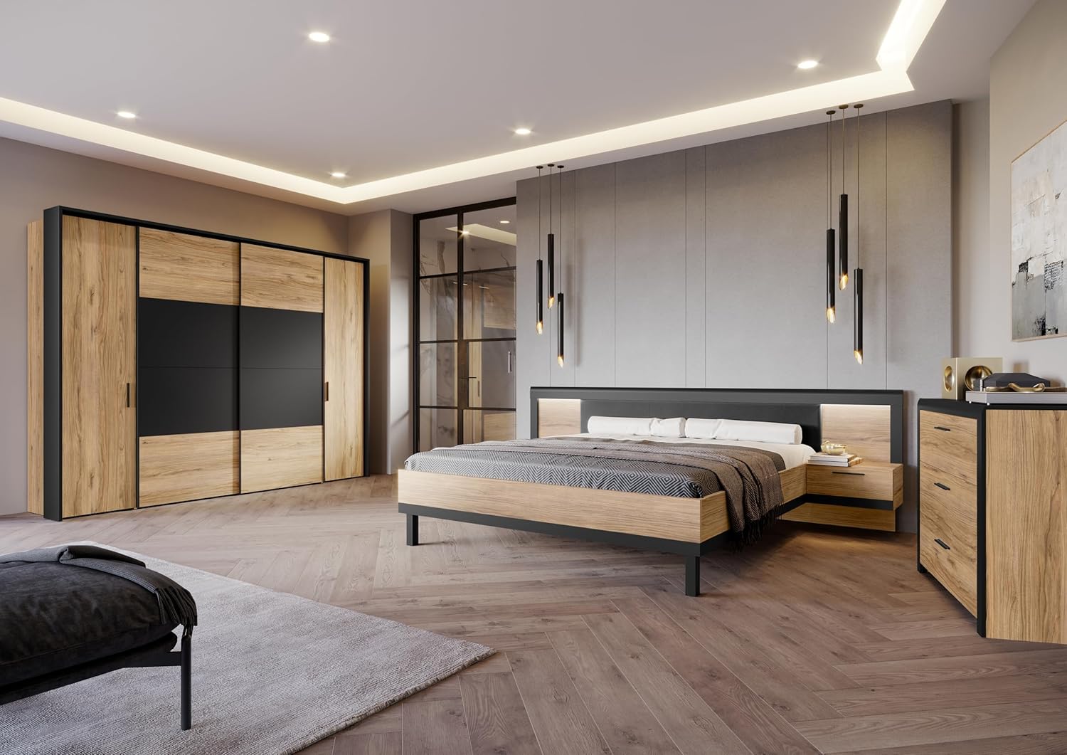 L’armoire moderne se compose de portes coulissantes et de deux paires de portes battantes. Elle a été fabriquée dans le décor chêne Catania avec un ajout de noir, ce qui lui confère exclusivité et propreté. L’armoire est idéale pour la chambre ou le dressing. Fabriqué en panneaux de particules de qualité supérieure. Il dispose de dix étagères et de deux tringles à vêtements. Charge maximale des tringles à vêtements : jusqu’à 15 kg. Charge maximale des étagères : 5 à 8 kg. Les portes coulissantes de l’armoire sont une solution confortable, surtout dans les couloirs étroits. Les étagères et les tringles à vêtements à l’intérieur de l’armoire offrent beaucoup d’espace de rangement. La surface est facile d’entretien