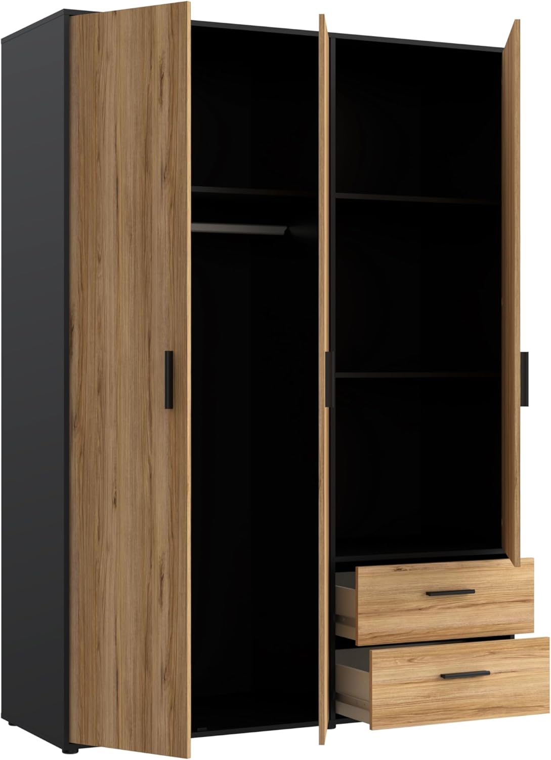 L’armoire à deux portes mise sur une combinaison de style et de fonctionnalité. Le premier aspect est la combinaison de couleurs du noir avec un décor qui transmet la beauté du grain naturel. Derrière les façades pleines, l’armoire cache une tringle à vêtements et des étagères pratiques sur lesquelles vous pouvez poser des pulls et des pantalons. Deux tiroirs pratiques dans la partie inférieure du meuble garantissent de la place pour les petits objets : accessoires de style et sous-vêtements. L’armoire et les commodes de la collection Mokkaro se combinent parfaitement entre elles et forment un développement cohérent de la chambre et du couloir. Exclusivement disponible dans les magasins de meubles ABRA et MERKURY. L’armoire combine un corps noir avec des façades en chêne Catania. Poignées pratiques en noir. Largeur : 144,4 cm, hauteur : 2,1 cm, profondeur : 52,7 cm. Permet de ranger facilement les vêtements. Charge maximale des étagères fixes : jusqu’à 1 kg. Charge maximale des étagères : jusqu’à 5 kg. Charge maximale des barres : 15 kg. Charge maximale des tiroirs : jusqu’à 3 kg – Armoire basculante à monter soi-même – Montage mural nécessaire (ferrures incluses)
