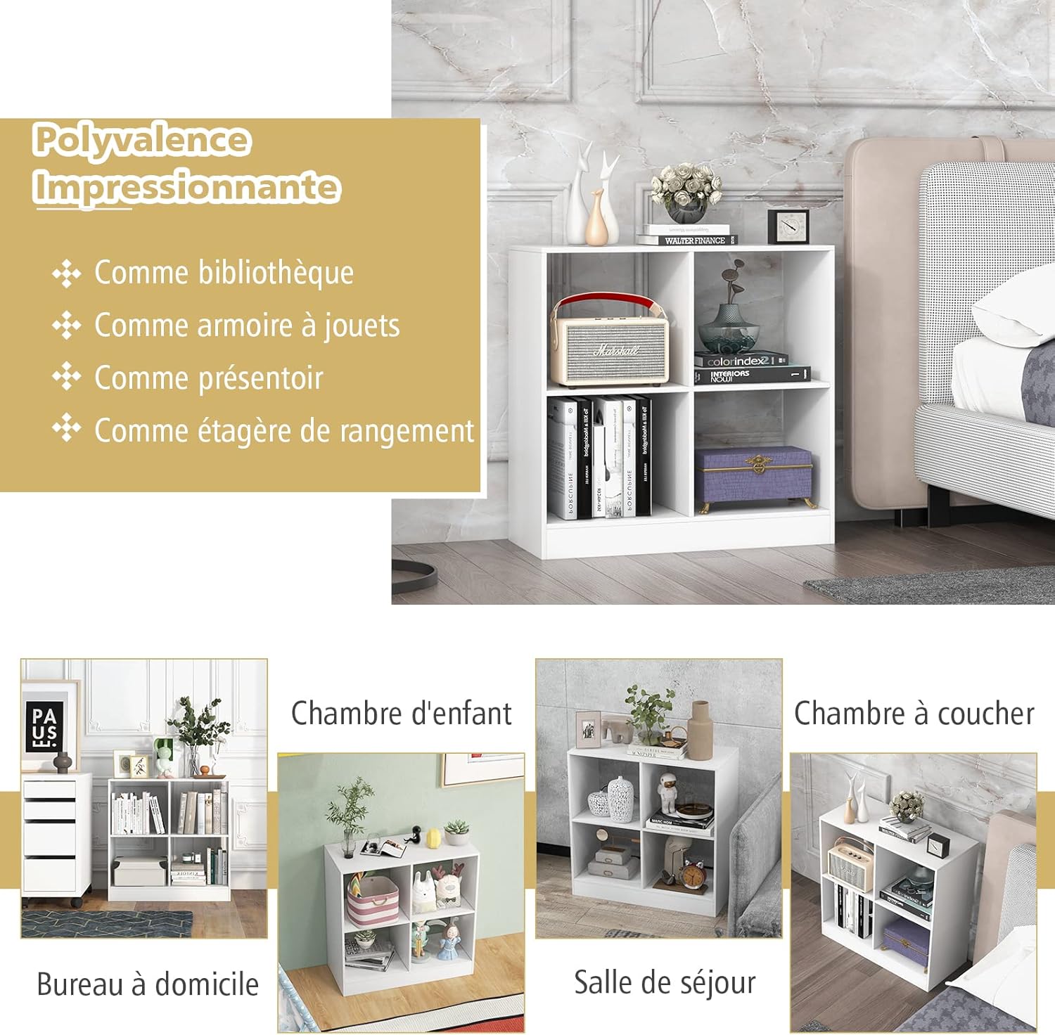 Bibliothèque de Rangement 4 Cubes: Combiné avec 4 cubes de rangement ouverts et un dessus rectangulaire spacieux, la bibliothèque offre beaucoup d’espace pour les affaires telles que les poupées, les jouets, les livres, les photos et les fournitures de sport.