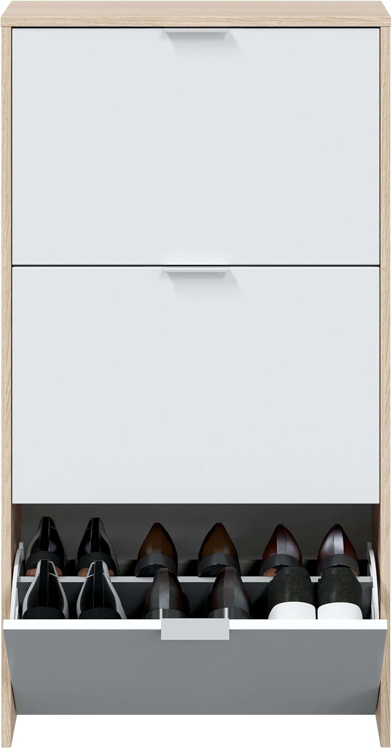 Matériaux : mélamine de haute qualité. Couleurs : blanc brillant, chêne ou blanc brillant et chêne. 3 portes avant rabattables. Capacité de 18 paires de chaussures. Idéal comme meuble d’appoint dans la chambre, le hall ou le couloir. Assemblage requis.