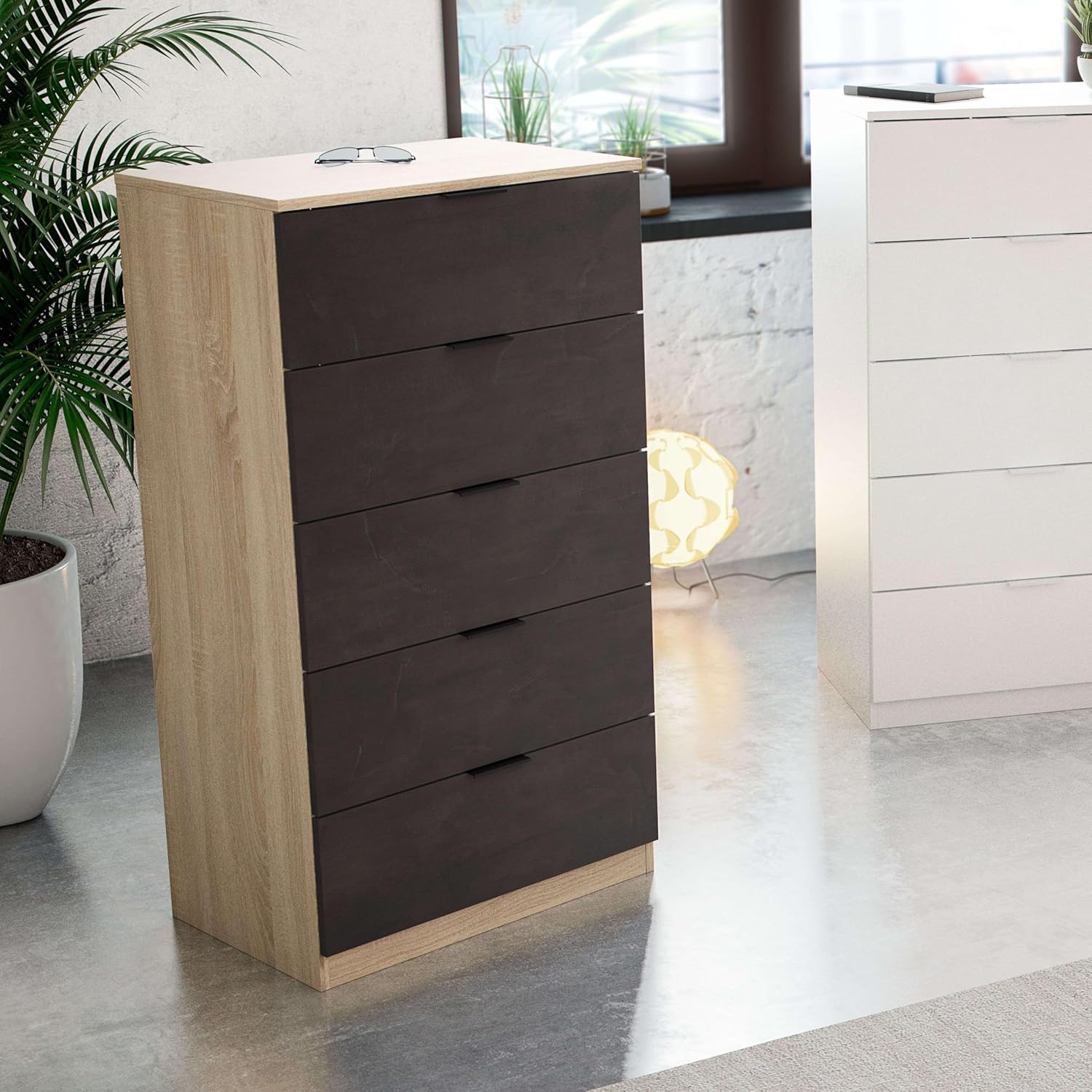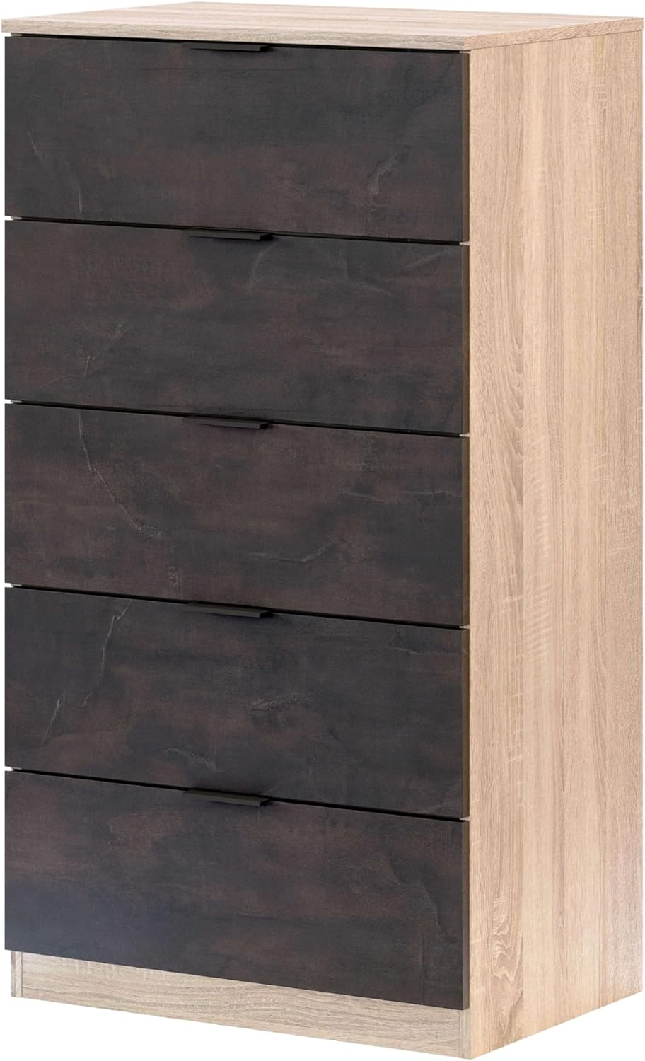 Habitdesign Modèle Alaya Commode 5 tiroirs / chiffonnier 110 x 60 x 40 cm Couleur chêne canadien et rouille.La commode Alaya à 5 tiroirs offre une grande capacité de rangement, elle est idéale pour ranger toutes sortes de vêtements et accessoires. Alaya est un chiffonnier aux lignes épurées qui s’adapte facilement à tout type d’espace. Comprend des poignées en aluminium et les ferrures de fixation du meuble au mur. Peut être combiné avec l’ensemble tête de lit + tables basses Alaya.Dimensions de la commode : 60 x 110 x 40 cm (l x H x P). Capacité des tiroirs : 53,5 x 10 x 35 cm (l x H x P). Poids maximum supporté par tiroir : 5 kg. Poids maximum total supporté : 30 kg.