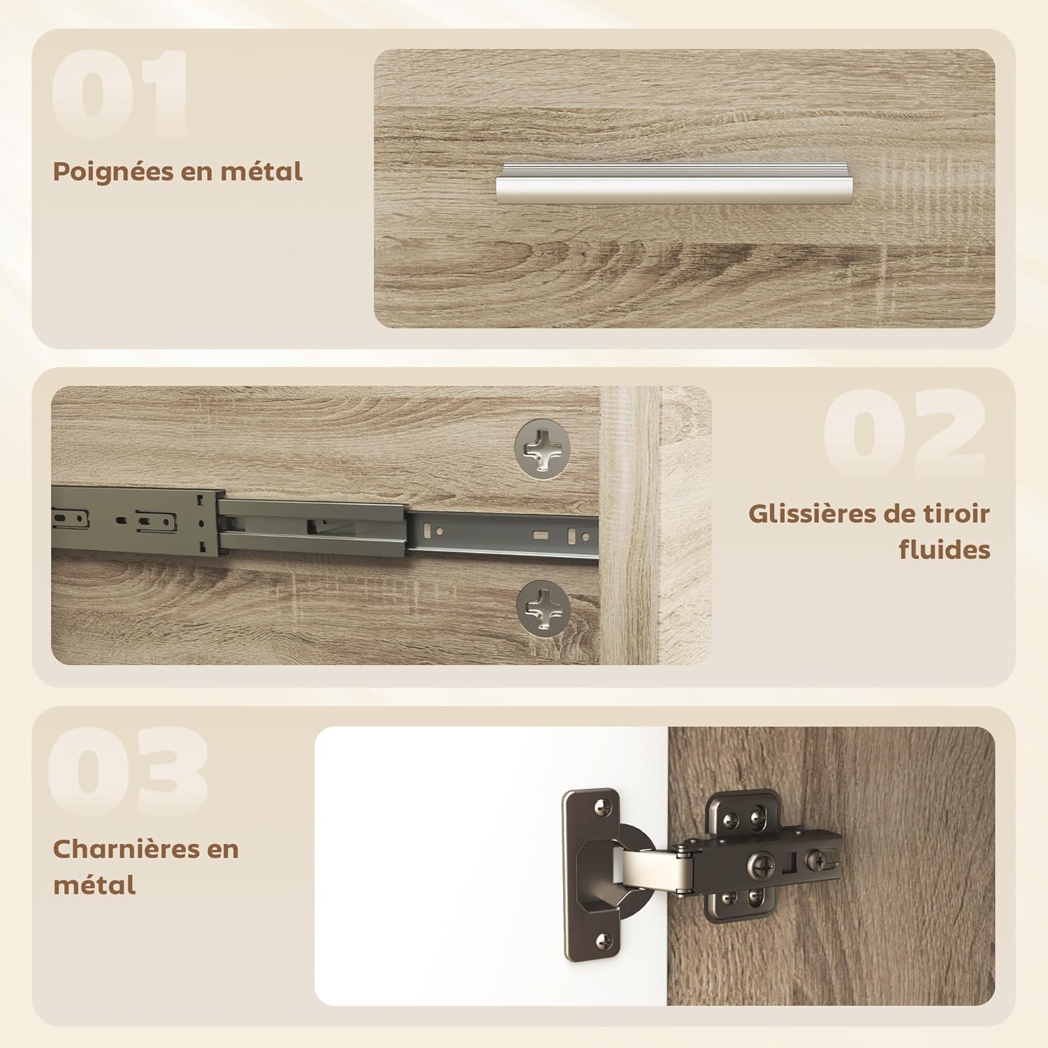 Couleurs blanc et bois naturel Matériau principal panneaux de particules Dim. totales 106L x 35I x 76H cm Dim. espace intérieur tiroirs 27,8L x 28,8l x 7,7H cm Dim. étagère réglable 68L x 33l cm Dim. porte placard gauche 35,2L x 72,5H cm Dim. porte placard droite 35,2L x 46H cm Dim. intérieure placard droite 33L x 33l x 45,5H cm Charge max. recommandée 50 Kg (au total), 10 Kg (playeau/tiroirs), 20 Kg (étagère) Réf. 837-003V00ND