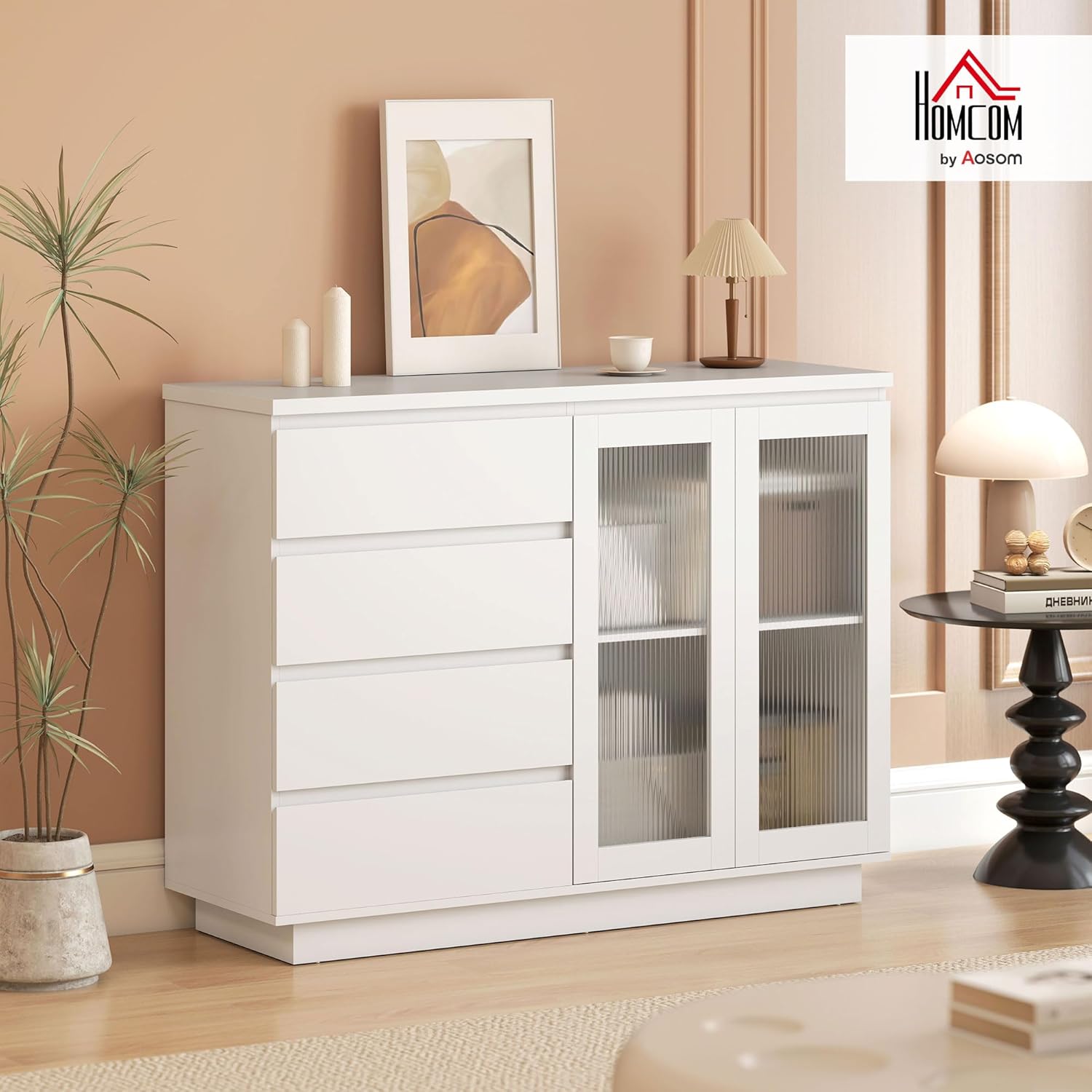 Grâce à ses quatre tiroirs et son placard, gardez votre intérieur parfaitement organisé Ce meuble de rangement avec des portes en verre cannelé met en valeur vos objets tout en dissimulant le désordre L’étagère réglable à trois niveaux pour un rangement flexible selon vos besoins Fermez les portes lentement et silencieusement grâce aux charnières à fermeture douce Meuble de salon en panneaux de particules et MDF, recouverte de mélamine, assure une robustesse à toute épreuve Pour la sécurité de votre famille, un kit anti-basculement est inclus Des patins protecteurs du buffet de salon préservent vos sols de toutes rayures et marques Assemblage requis