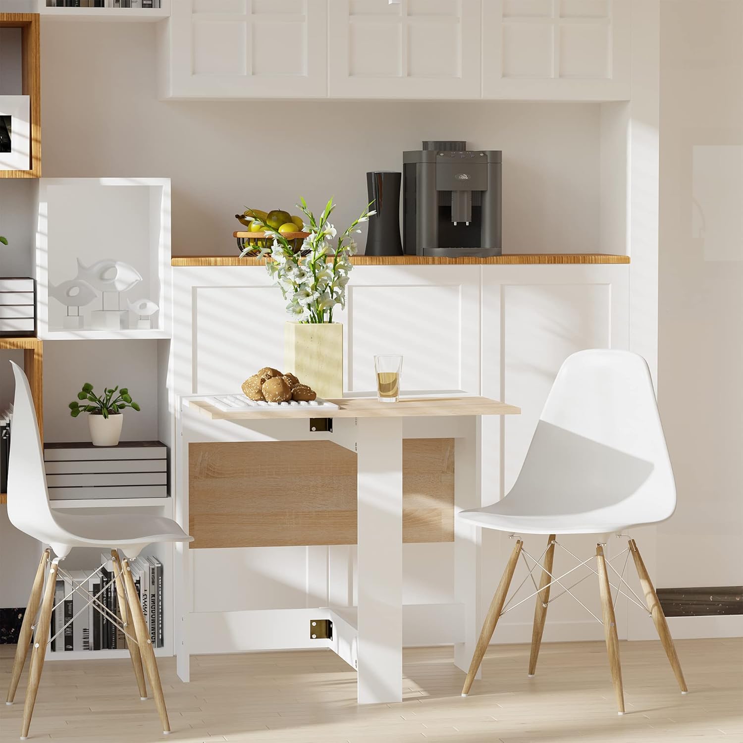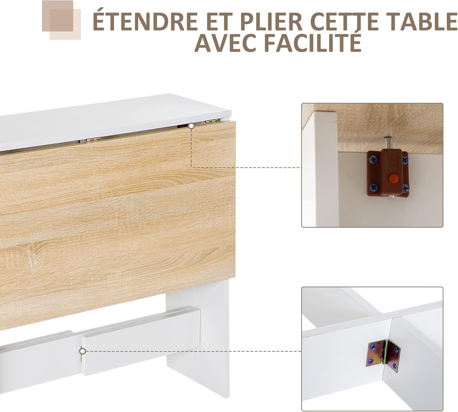 Couleur chêne, blanc Matériaux MDF épaisseur 1,5 cm Dim. dépliées 103L x 76l x 74H cm Dim. semi-pliées 76L x 65l x 74H cm Dim. entièrement pliées 76L x 27l x 74H cm Charge max. recommandée 60 Kg Réf. 833-447