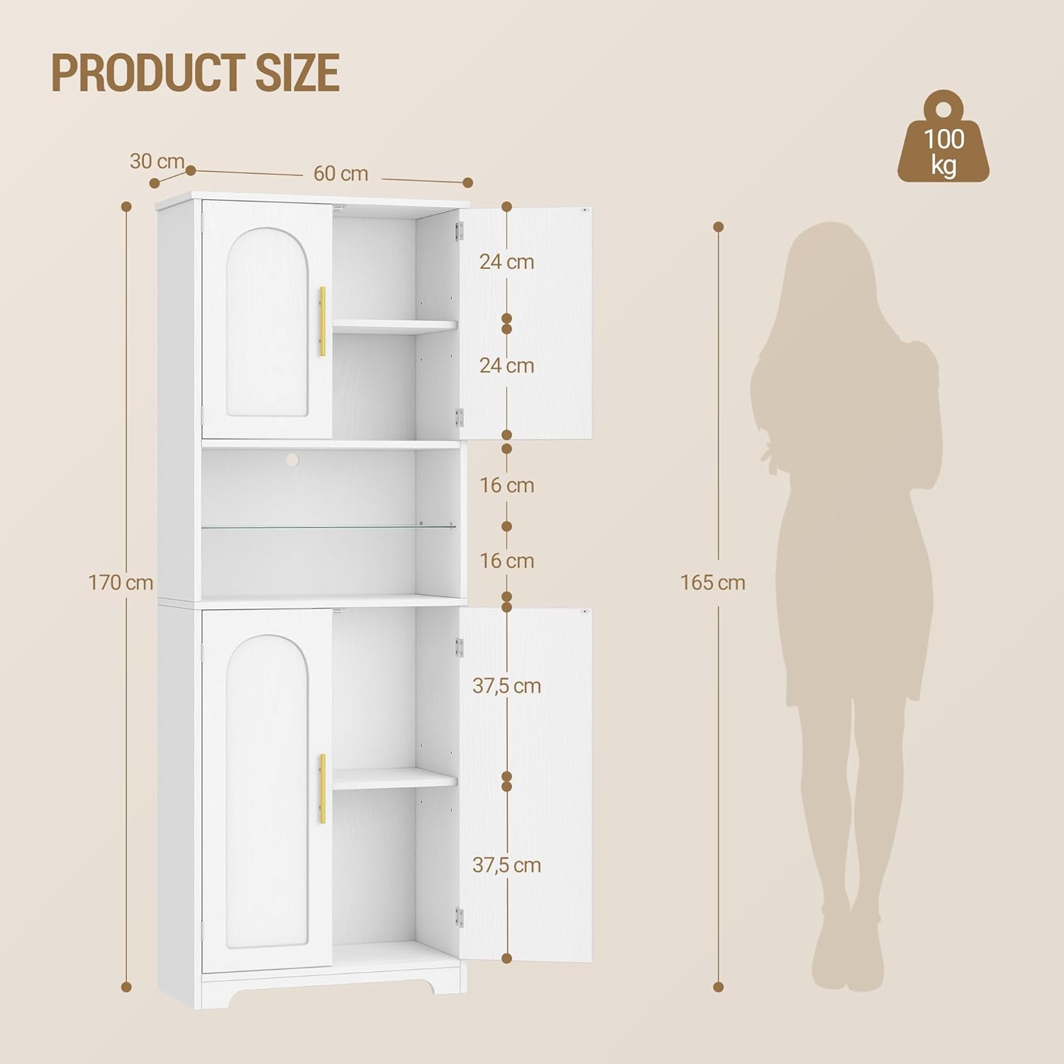 Couleur : Grain de bois blancMatériau : Panneau de particulesDimensions du produit : 30 x 60 x 170 cmPoids du produit : 27,9 kgCapacité de charge statique maximale : 100 kg1 x Meuble de rangement1 x Kit d’accessoires1 x Dispositif anti-basculement1 x Manuel d’instructions