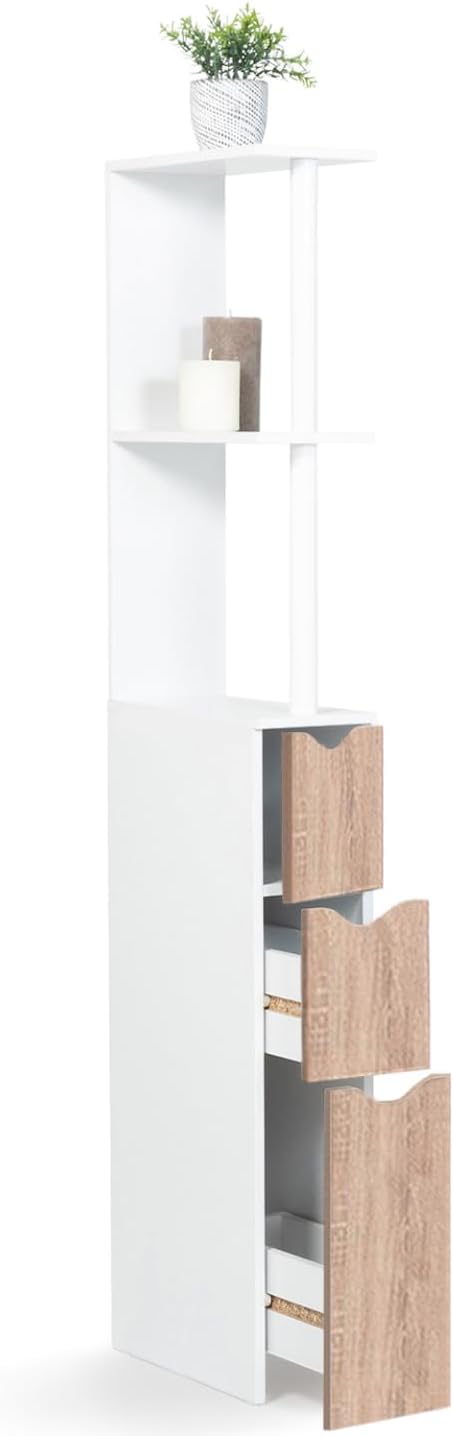 Spécialement conçu pour aménager les petits espaces, ce meuble en bois mélaminé est idéal pour un rangement fonctionnel dans votre salle de bain, buanderie ou vos WC.Très compact grâce à ces dimensions travaillées, ce meuble 3 portes + étagères offre un grand potentiel de rangement. Dimensions 136 cm de hauteur pour 33 cm de profondeur et seulement 15 cm de largeur !Ses trois étagères (composées de 2 tablettes), son placard et ses deux grands tiroirs lui confèrent pleins d’atouts de rangement ! La partie inférieure avec ses portes de placard vous permet notamment de ranger les produits peu esthétiques : rouleaux de papier toilette et produits d’entretien…Ce nouveau modèle au design contemporain en bois mélaminé blanc et portes façon hêtre est la solution pour tout ranger à portée de main même dans les petits espaces !Dimensions meuble WC WILLYDimensions globales : Longueur 15 cm x largeur 33 cm x hauteur 136 cmHauteur placard du haut : 19,5 cmHauteur tiroir du milieu : 18,3 cmHauteur tiroir du bas : 36,5 cmÀ monter soi-mêmePlusieurs coloris disponibles pour ce modèle. Retrouvez tous nos meubles WC sur notre boutique en ligne !