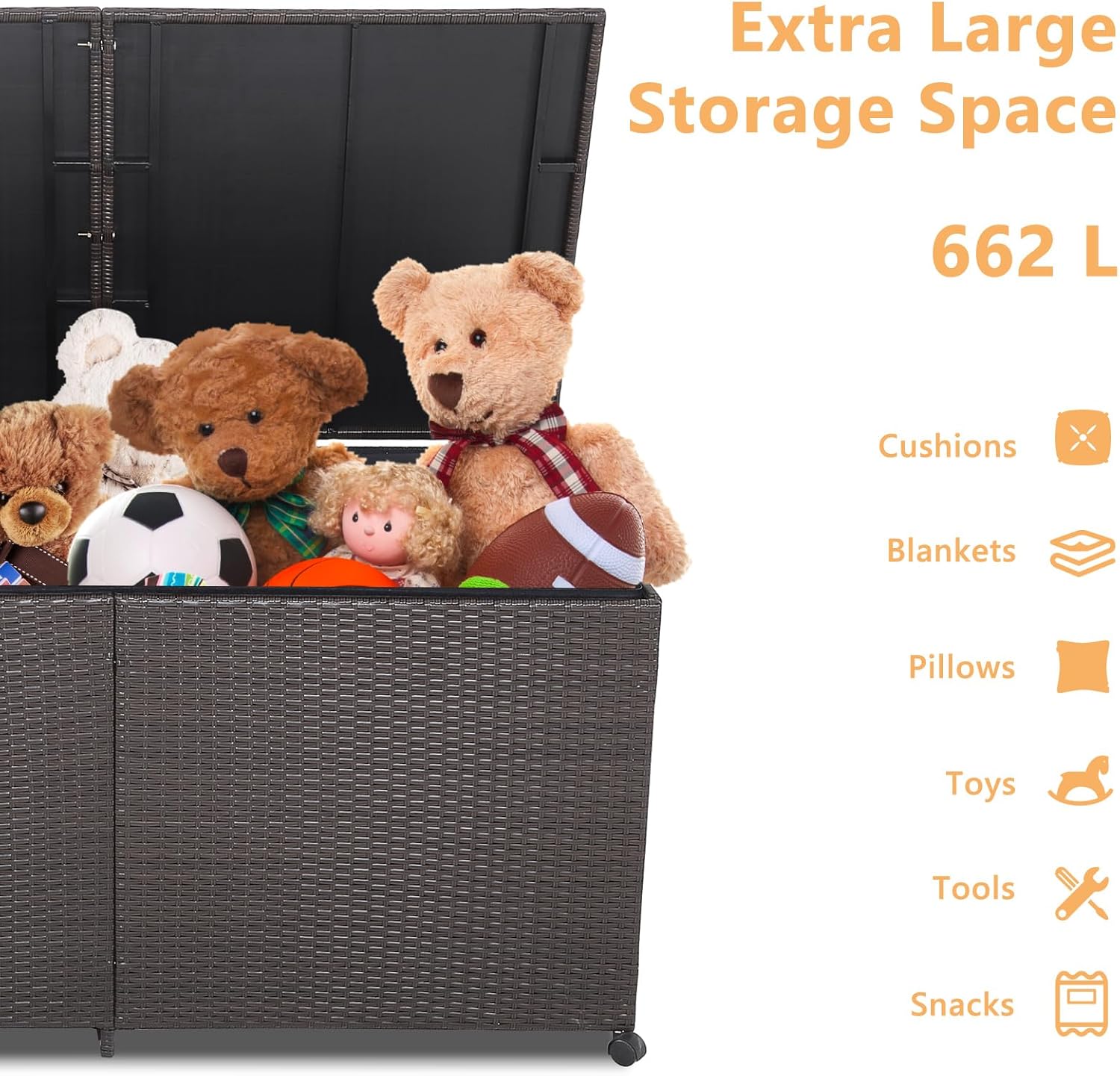 【Grande capacité de 662 L】Avec des dimensions intérieures de 146 x 72 x 63 cm et une grande capacité de 662 L pouvant être utilisée pour les coussins, les peluches, les équipements de sport, les outils de jardinage et bien plus encore, cette boîte de rangement est l’option de rangement idéale pour vous.