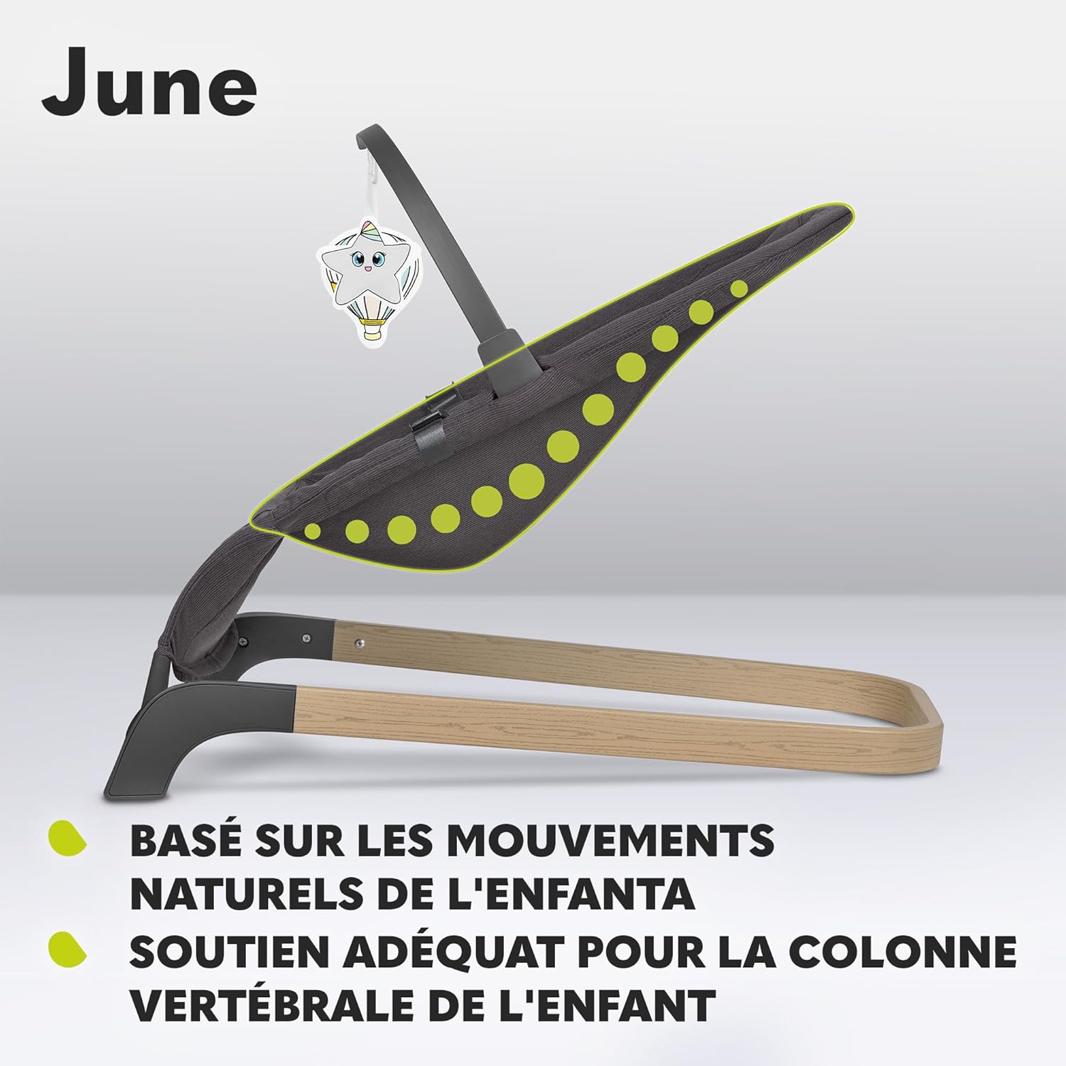 JUNE: Un transat qui imite le mouvement de balancement naturel. Il bouge grâce aux mouvements naturels du bébé, ce qui développe la conscience de son corps et la capacité à maintenir son équilibre
