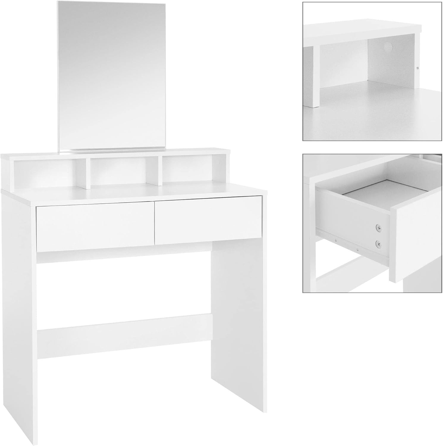 Molto spazio di archiviazione grazie ai cassetti e agli scomparti. Include specchio, due cassetti e tre scomparti aperti. Oggetti importanti sono a portata di mano. Guida semplice, scorrimento fluido. Design moderno con generosa superficie di appoggio. Lavorazione robusta. Superficie antigraffio. Facile da pulire. Facile da montare. Ideale per la camera da letto di donne e ragazze.