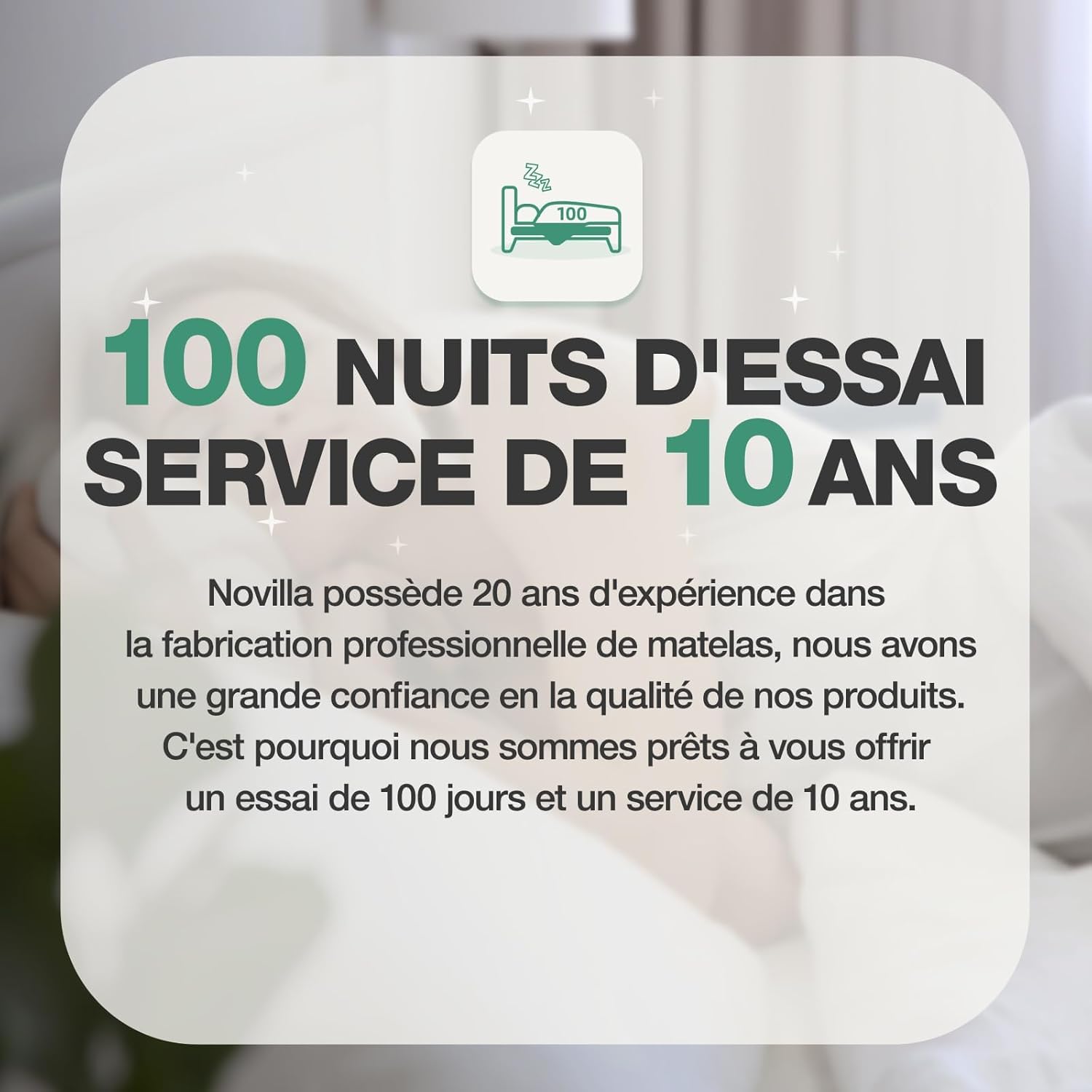 Essai de 100 Nuits et 10 Ans de Service La marque Novilla vous offre 100 nuits d’essai et 10 ans de service.Pour tout problème de qualité avec votre matelas Novilla, veuillez contacter immédiatement l’équipe du service après-vente Novilla à l’adresse email fournie dans la brochure pour vous aider à résoudre le problème.Le matelas Novilla prendra un minimum de 72 heures pour se rétablir après le déballage de votre matelas Novilla, donc soyez Soyez donc patient.
