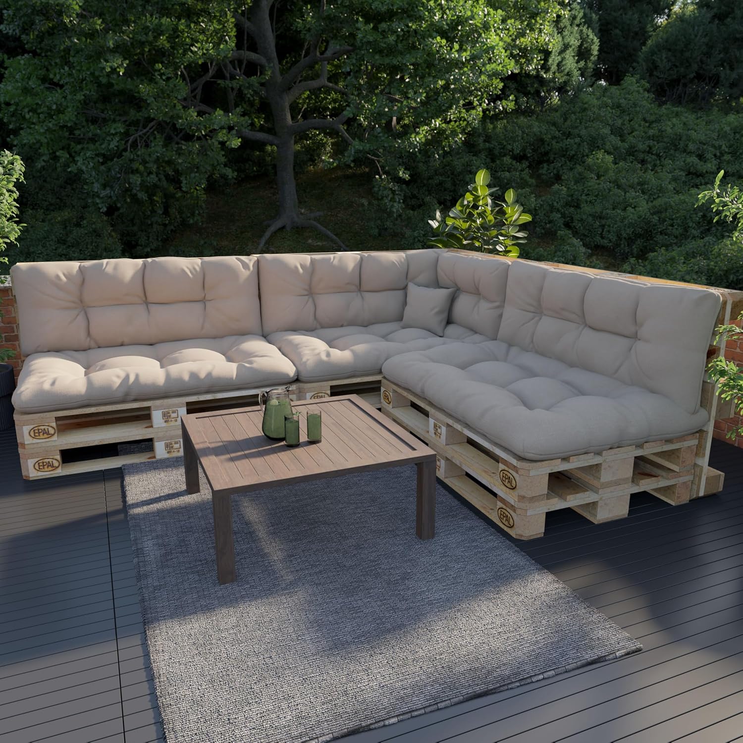 Confort et commodité, à l’intérieur et à l’extérieur: ces coussins confortables pour les palettes EUROPE vous permettront d’utiliser une palette EUROPE et la transformer en meubles confortables de jardin, de terrasse, de tonnelle, de maison, de restaurant, de café, de salle de séjour et même de bureau. Les palettes Europe transformées en meubles de jardin constituent une excellente alternative aux meubles traditionnels, comme des fauteuils ou des divans. Elles sont pleines stylées.