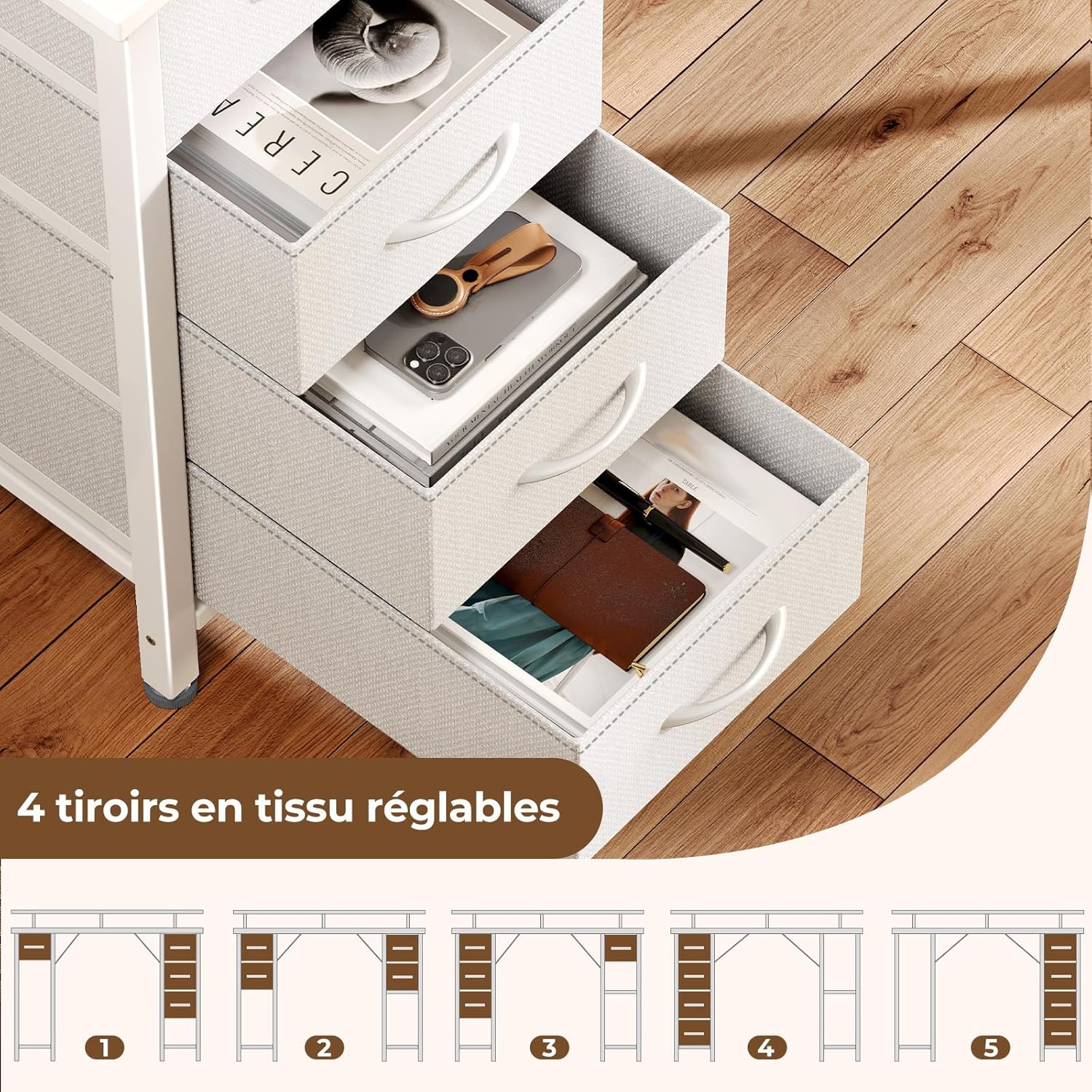 4 tiroirs modulables et étagères spacieuses : Organisez votre espace avec 4 tiroirs en tissu dont la position peut être adaptée selon vos besoins, ainsi que deux niveaux d’étagères ouvertes, parfaits pour ranger documents, périphériques, livres ou fournitures de bureau. Une solution de rangement flexible, idéale même pour les petits espaces.