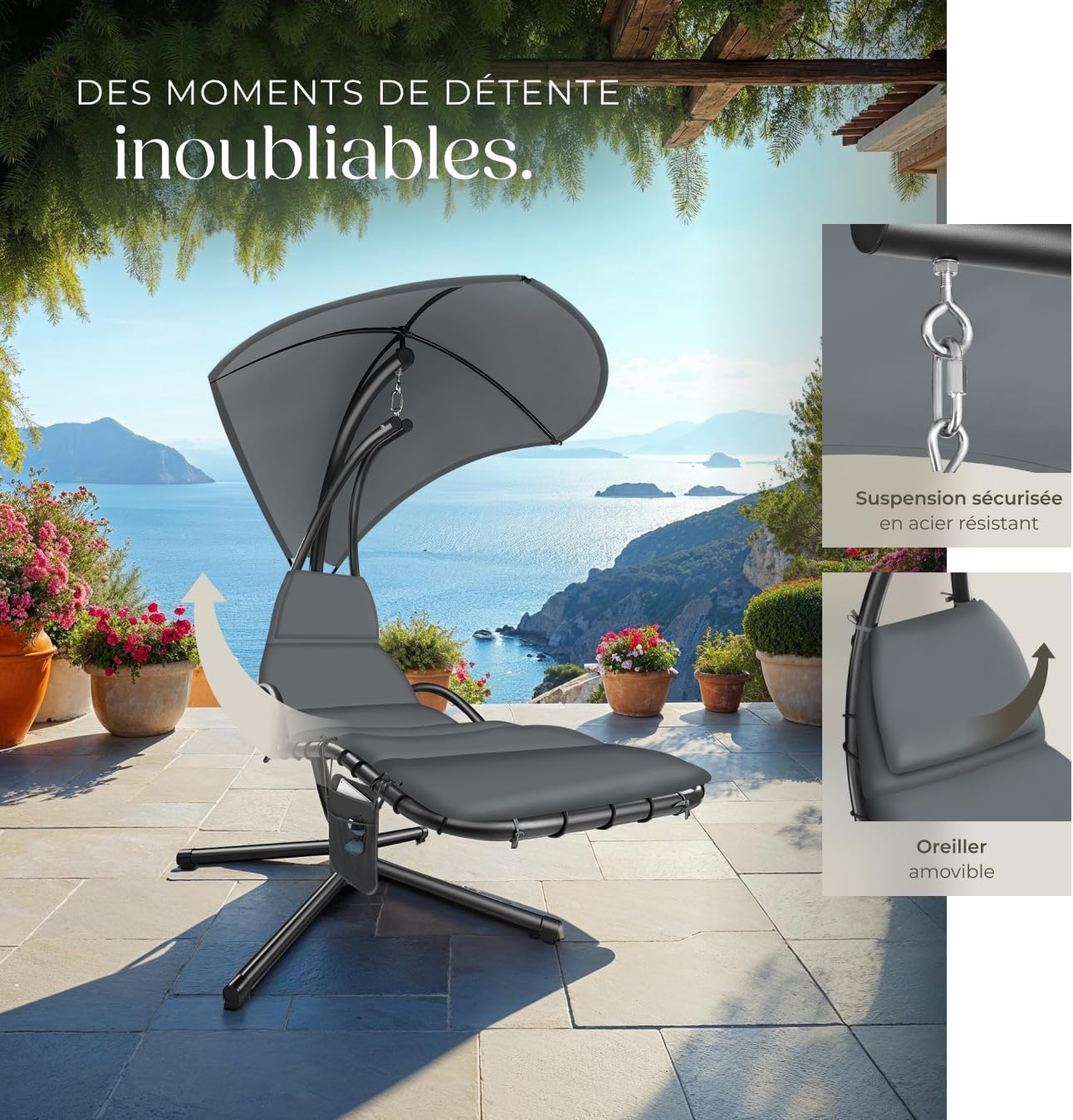 DÉTENTE ET DESIGN EN HARMONIE : Notre chaise longue suspendue allie esthétique et confort. Avec son siège de haute qualité et son design chic, ce fauteuil suspendu extérieur vous enveloppe dans un confort optimal. La surface de couchage ergonomique, le rembourrage doux lavable, et l’oreiller intégré transforment votre jardin ou salon en un havre de paix. Idéale pour les amateurs de relaxation, notre chaise longue jardin extérieur réinvente le concept du fauteuil relax jardin.