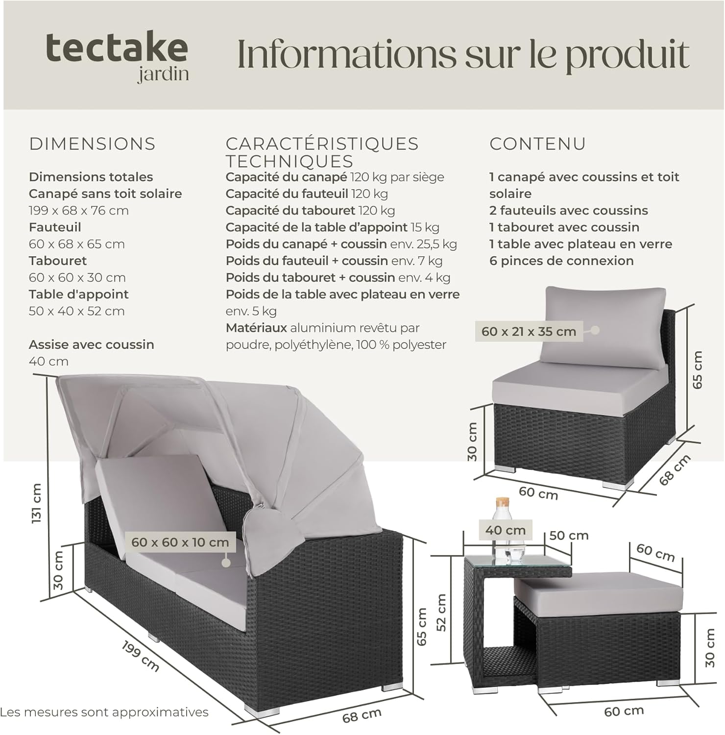 Dimensions totales du canapé avec protection solaire ouverte (LxPxH) : env. 199 x 68 x 131 cmDimensions totales du canapé avec protection solaire fermée (LxPxH) : env. 199 x 68 x 76 cmDimensions totales du fauteuil (LxPxH) : env. 60 x 68 x 65 cmDimensions totales du pouf (LxPxH) : env. 60 x 60 x 30 cmHauteur d’assise (avec coussin) : env. 40 cmDimensions du coussin d’assise (LxPxH) : env. 60 x 60 x 10 cmDimensions coussin de dossier (LxPxH) : env. 60 x 21 x 35 cmDimensions totales de la table d’appoint (LxlxH) : env. 50 x 40 x 52 cmDimensions du plateau en verre (LxlxH) : env. 49,5 x 39,5 x 0,5 cm