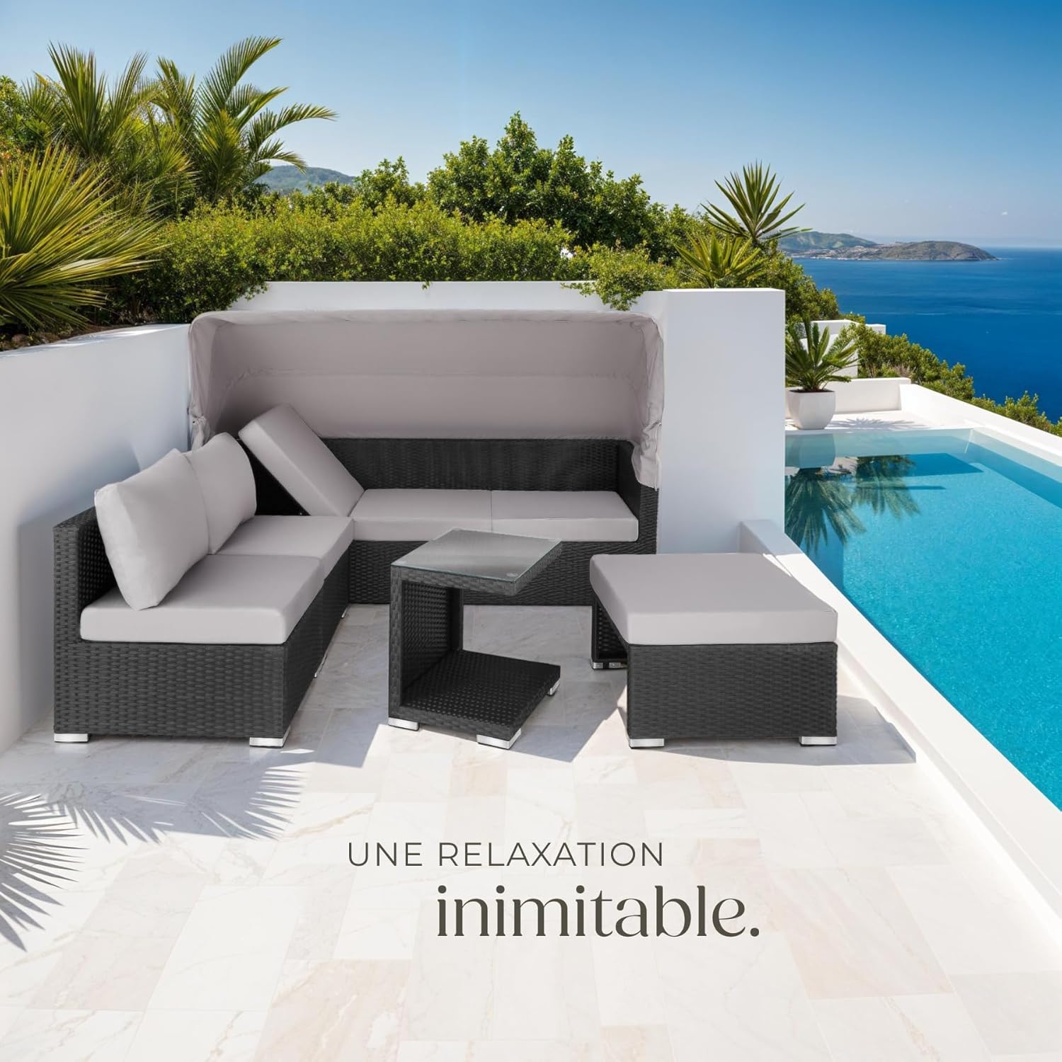 Points Forts Tressage de haute qualité en polyrattan résistant aux UV Structure robuste en aluminium léger Construction résistante aux intempéries Pare-soleil pliable Éléments à moduler avec des clips de fixation selon vos besoins Table d’appoint avec plateau amovible en verre de sécurité Coussins extra-épais et imperméables Housses amovibles et lavables