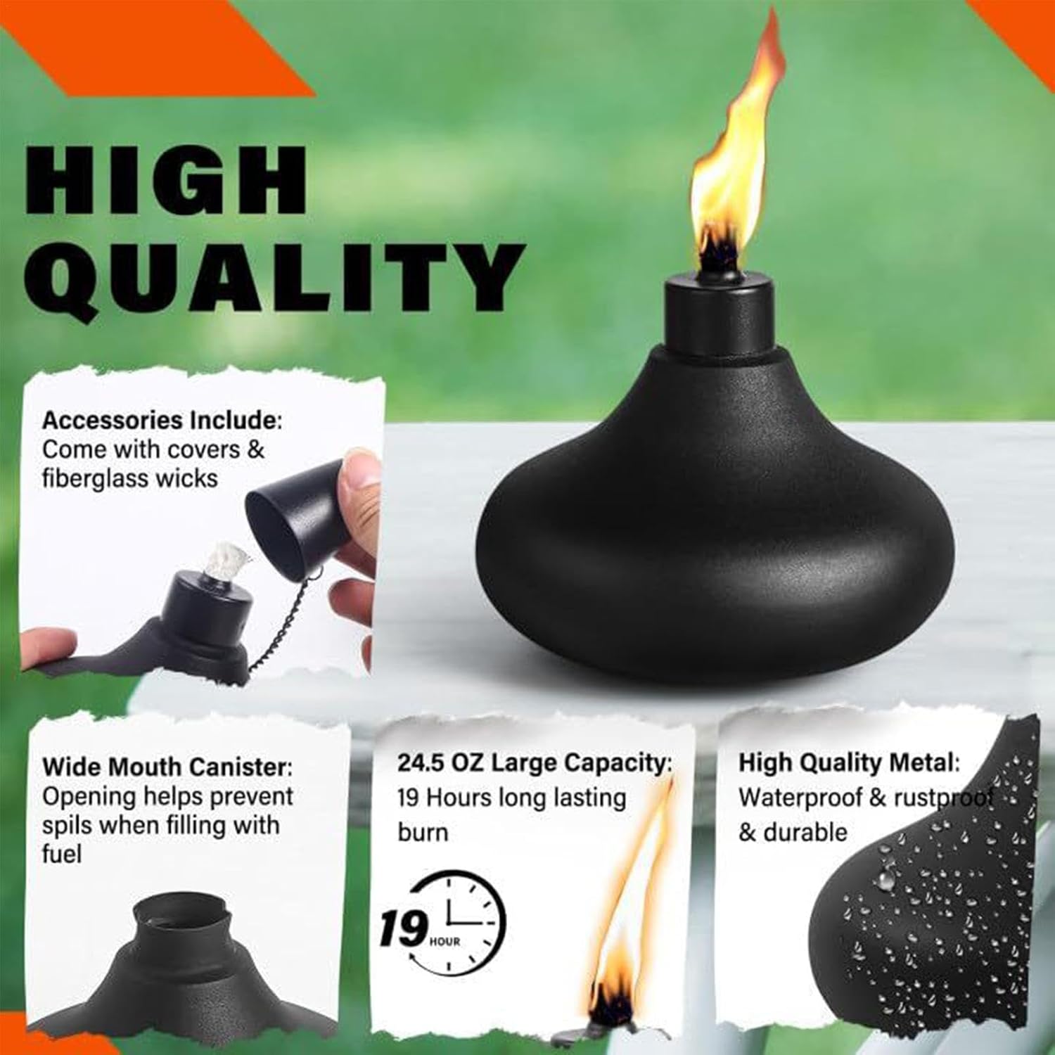 Mèche longue durée : notre cartouche de torche rechargeable dispose d’une mèche en fibre de verre qui dure indéfiniment dans le cadre d’une utilisation normale, surpassant les mèches en coton pour une longue durée de vie et de bonnes flammes. Idéal pour les besoins d’éclairage extérieur, des barbecues dans le jardin aux réceptions de mariage