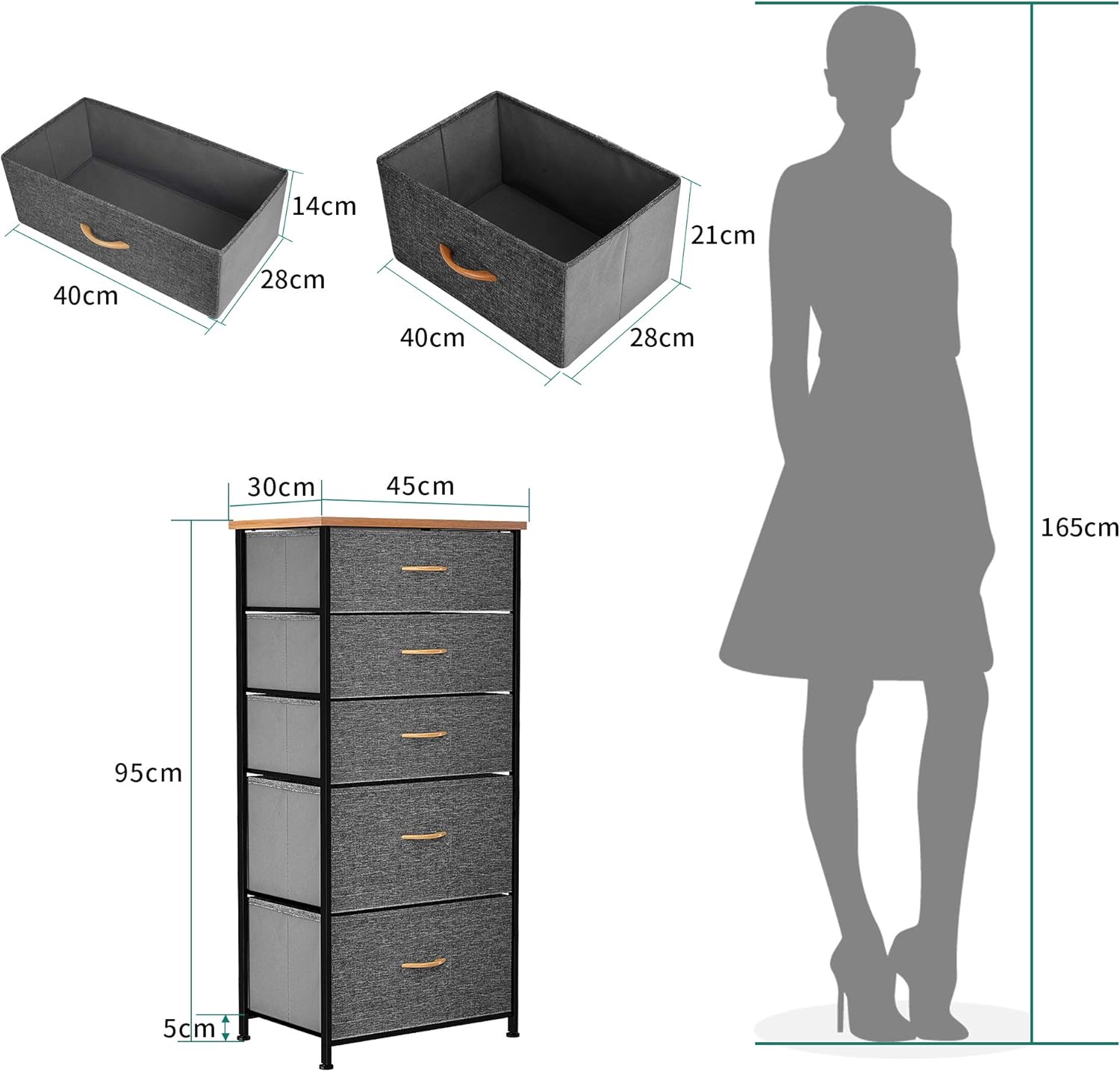 GRAND CAS – Mesurant 45 x 30 x 95CM (LxlxP), ce meuble de rangement léger s’intègre sans effort dans la plupart des espaces. Les 4 tiroirs encastrés mesurant 40 x 28 x 14CM / 40 x 28 x 21CM (LxlxP) offrent à votre ménage davantage de possibilités de rangement.