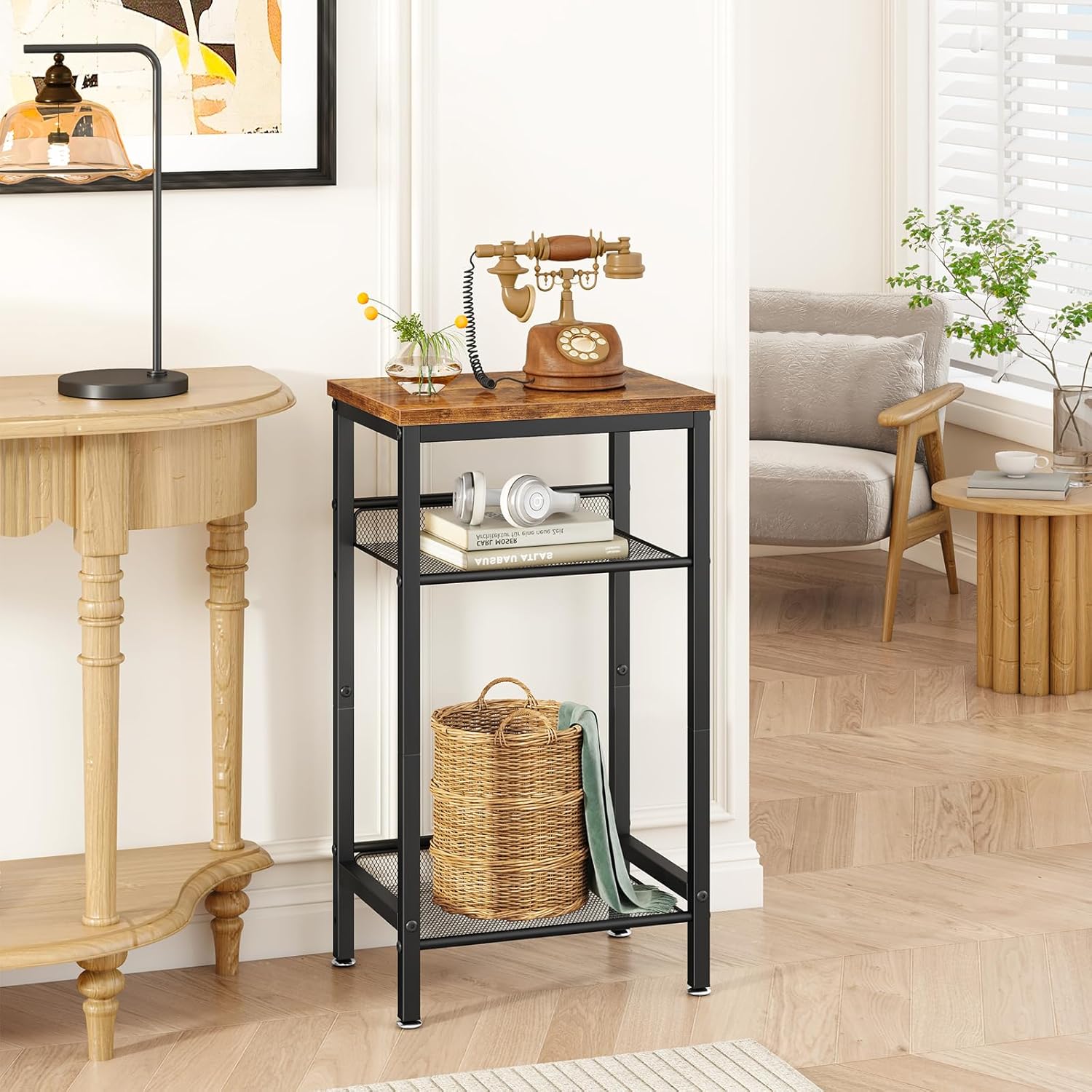 Polyvalence : Cette table rétro haut de gamme a une capacité de charge de 50 kg pour la plaque supérieure et 15 kg pour chaque étagère, et est largement utilisée. Elle peut être placée dans la chambre, le salon, les coins, le couloir, etc. En tant que table de chevet avec étagères, elle peut également être placée à côté du bureau, et en tant que table à téléphone, elle peut même accueillir une imprimante ou un ordinateur de bureau. Dimensions : 28 l × 38 L × 73 H cm