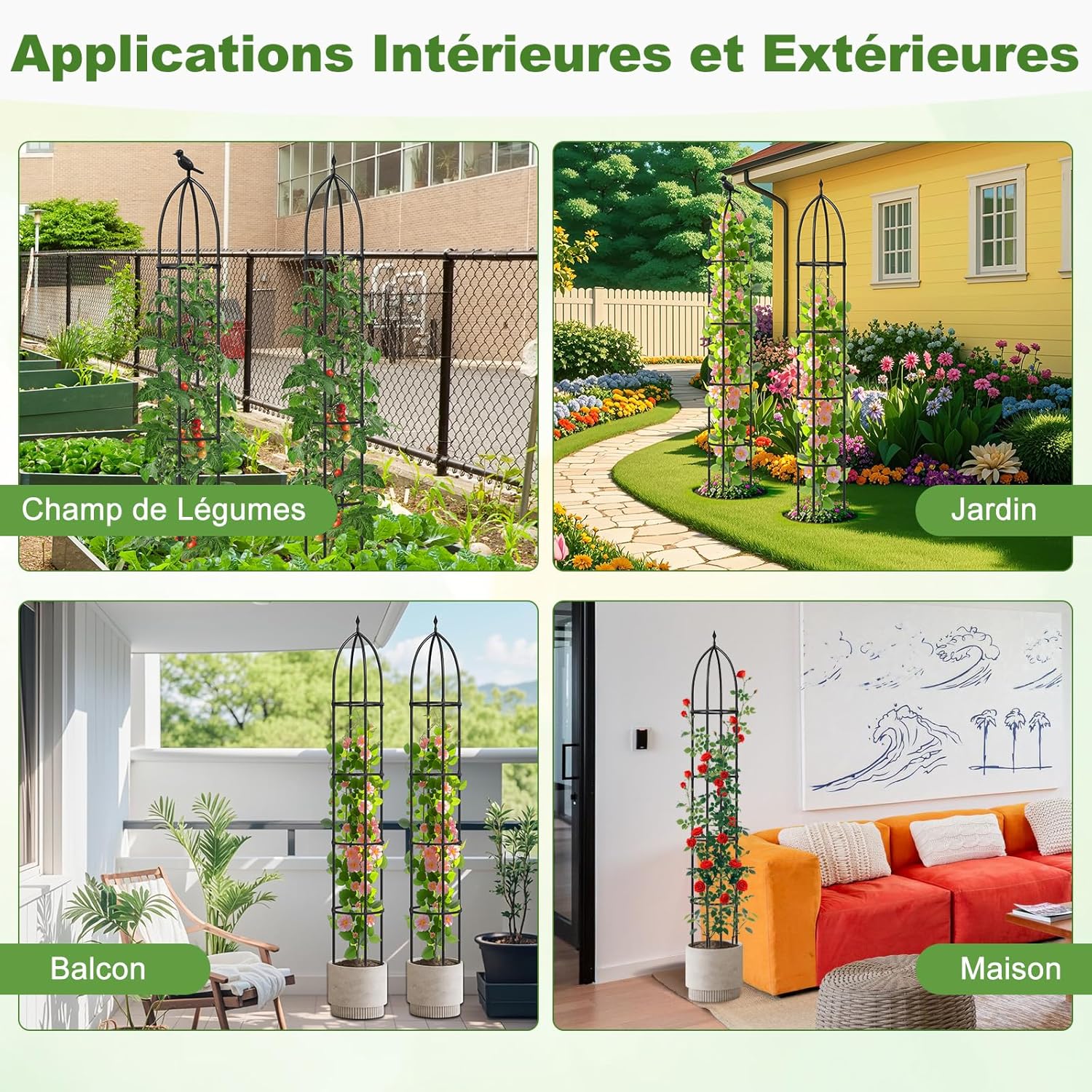 【Convient à diverses plantes grimpantes】Des tomates, concombres et haricots aux roses chinoises, clématites, gloires du matin et bien plus encore, ces treillis obélisques conviennent à une large gamme de plantes grimpantes. Ils offrent la structure parfaite pour aider vos légumes et fruits à prospérer, améliorant ainsi la santé des plantes et leur rendement.