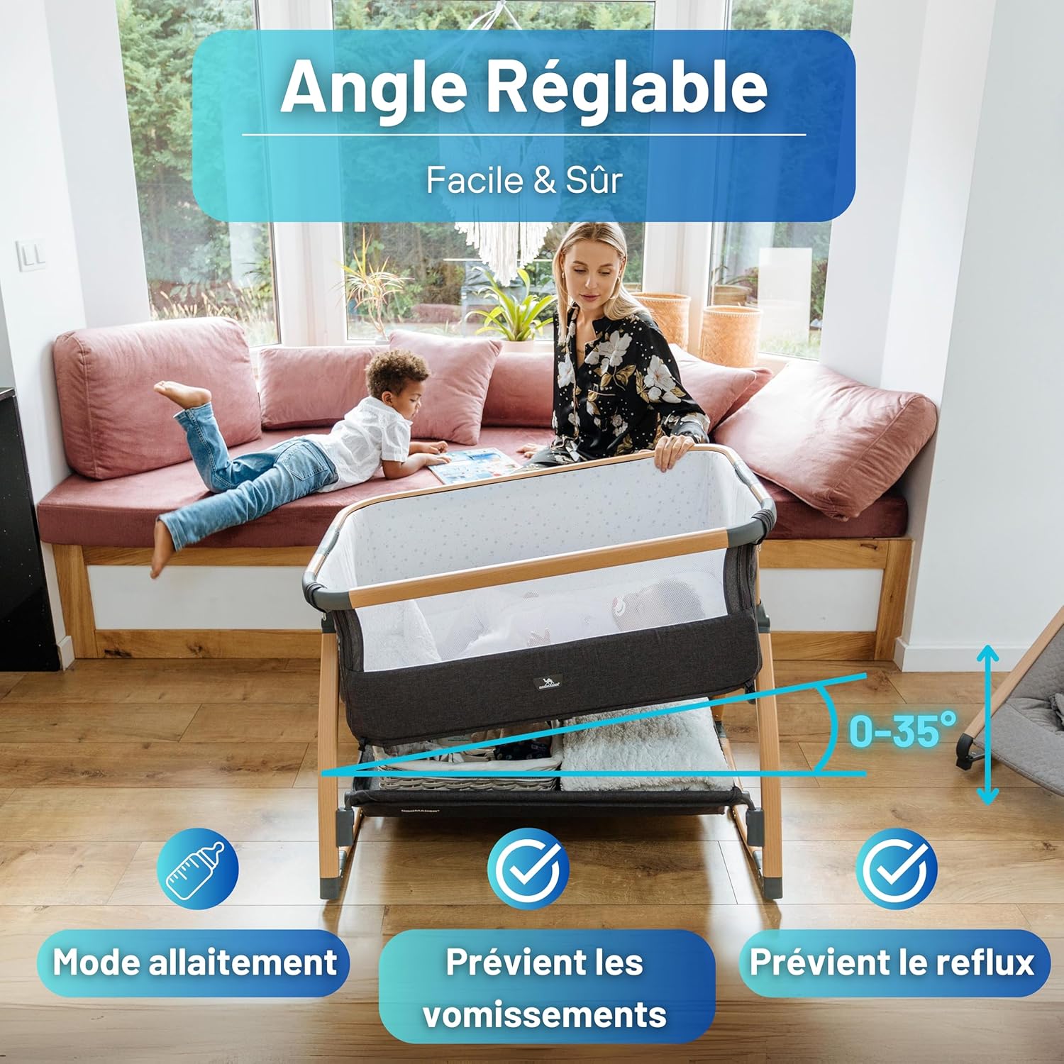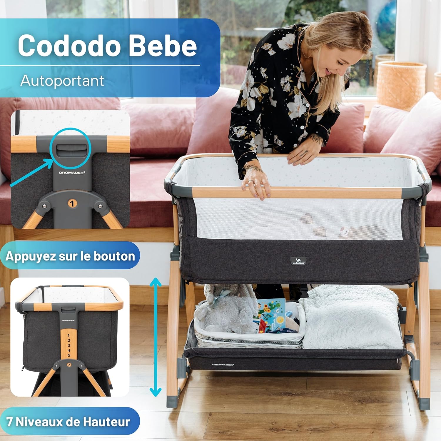 Polyvalence et Adaptabilité : Ajustable sur 7 niveaux de hauteur pour s’adapter à tous les types de lits adultes. Idéal pour le co-sleeping ou comme lit autonome pour votre nouveau-né