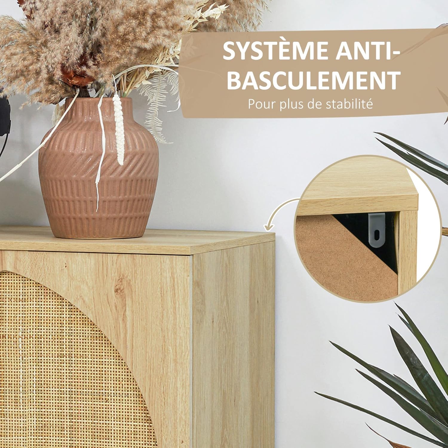 Meuble de chambre style naturel mêlant originalité et élégance, idéale pour ajouter une touche authentique à votre intérieur Jolie mixité des matériaux : aspect bois et cannage pour sublimer votre intérieur Jolie finition : poignées bouton métal noir, façades portes placard avec empiècement arrondi en cannage et pieds effilés Meuble de salon multi-rangement : 1 grand placard double porte avec à l’intérieur 1 étagère apportent un bel espace de rangement pour ranger du linge de maison, de la vaisselles ou d’autres affaires Matériaux de qualité, usage pérenne : piètement métal robuste, structure haute en panneaux de particules classe E1 (charge max. recommandée totale de 60 Kg) Dispositif arrière anti-basculement : sécurité optimum d’utilisation Montage facile et rapide grâce au manuel d’assemblage illustré fourni