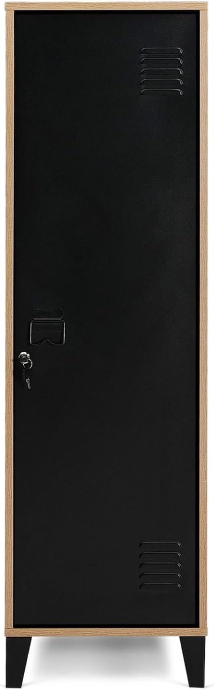 Craquez pour la tendance industrielle avec notre armoire vestiaire métal noir et bois ESTER, elle sera rapidement l’élément phare de votre bureau, séjour, entrée ou chambre à coucher !Idéale en meuble d’appoint, entreposez sur ses étagères vêtements, dossiers, livres, vaisselle légère ou encore jeux de société. Ce meuble de rangement s’adapte à vos envies et s’intégrera facilement à la pièce de votre choix grâce à ses coloris tendances et à ses lignes sobres !Avec ses 3 niveaux de rangement vous allez pouvoir classer et organiser vos documents administratifs. Vos affaires restent à portée de main et sont en sécurité grâce à son système de fermeture à clé !Ses 2 étagères intérieures multipositions vous permettent d’organiser et de moduler la capacité de rangement à votre guise, selon vos besoins, en disposant par exemple des porte-revues ou des classeurs sur les différents niveaux pour archiver vos documents !Ses 4 pieds en métal vous garantissent stabilité et robustesse, sans oublier le côté design renforcé par la porte en métal avec grilles d’aération façon vestiaire.N’hésitez plus et laissez-vous tenter par cette armoire vestiaire ESTER pratique et design pour sublimer votre intérieur !Dimensions de l’armoire vestiaire ESTER bois porte métal noireDimensions globales : Longueur 38,5 cm x Largeur 38,5 cm x Hauteur 133 cm2 étagères multipositionsHauteur des pieds : 10 cmFermeture à l’aide des 2 clés inclusesPorte et pieds en métalStructure en PB – épaisseur 1,5 cm (particules de bois)À monter soi-mêmeCe modèle est également disponible en blanc, noir, gris et bleu foncé.Retrouvez l’ensemble de notre collection métal sur notre boutique en ligne !