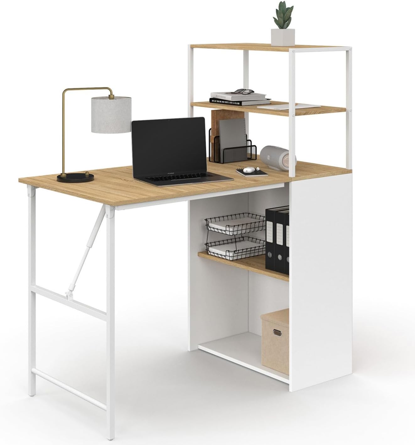 Le bureau bibliothèque pliable RAY bois façon hêtre et blanc au design contemporain et élégant s’intégrera parfaitement à tout type d’intérieur.Son long plateau de 103,5 cm vous permettra d’installer votre poste d’ordinateur, vos accessoires de bureau, tout en disposant d’assez d’espace pour travailler. Fonctionnels, les espaces de rangement ouverts ont été spécialement conçus pour vous permettre de ranger vos livres, vos classeurs, vos boites de rangement ou pour disposer vos objets de décoration. L’étagère bibliothèque vous donne la possibilité d’avoir tous vos documents et livres bien rangés et à portée de main en laissant le plateau du bureau libre et dégagé. Une fois le bureau déplié, vous pourrez travailler confortablement dans la pièce de votre choix ! Lorsque vous avez fini, il se plie en un clin d’œil en étagère bibliothèque et vous donne accès à deux étagères pour installer vos objets de décoration. L’espace de rangement est réversible et s’intègrera dans les petits studios comme dans les grands espaces de vie que vous décidiez de placer l’étagère bibliothèque sur la gauche ou sur la droite !Stable et robuste grâce à sa structure en particules de bois et son pied en métal, aménagez-vous un coin bureau en toute sécurité. Multifonctions et gain de place, il peut faire office de mange-debout et s’intégrera parfaitement dans un salon ou une salle à manger. Entreposez votre vaisselle sur les 3 étagères et profitez de son grand plateau pour prendre le petit déjeuner, manger sur le pouce ou prendre un apéritif entre amis ! Découvrez dès maintenant les finitions particulièrement soignées du bureau bibliothèque pliable RAY à petit prix.Dimensions du bureau bibliothèque pliable RAY bois blanc et façon hêtreDimensions globales du bureau : Longueur 103,5 x largeur 60 x Hauteur 120 cmHauteur du bureau : 75 cm Hauteur de la bibliothèque : 120 cm Dimensions du bureau replié : L. 30 x l. 60 x H. 120 cmDimensions des étagères inférieures : L. 26,5 x l. 57 x H. 35,5 cm Dimensions des étagères supérieures : L. 30 x l. 57 x H. 21 cmMatériaux : Particules de bois (PB) et métalColoris : Bois façon hêtre et blancA monter soi-mêmeRetrouvez tous nos modèles de bureaux sur notre boutique en ligne.