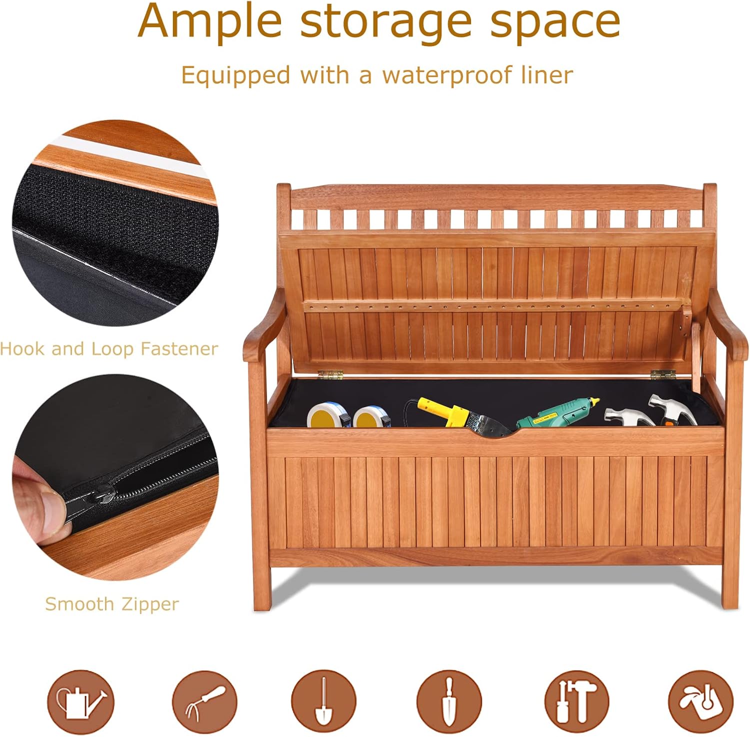 Le bois naturel d’eucalyptus garantit la sécurité et la robustesse, tandis que le dossier ergonomique et les accoudoirs incurvés assurent le confort. Ce banc a également un grand coffre qui peut s’ouvrir avec simplicité et sécurité grâce à sa rainure semi-circulaire, ses coulissantes et ses charnières robustes. Il est parfait pour l’extérieur, comme les balcons et les porches, car le sac imperméable amovible à l’intérieur protège bien vos effets personnels en cas de pluie.